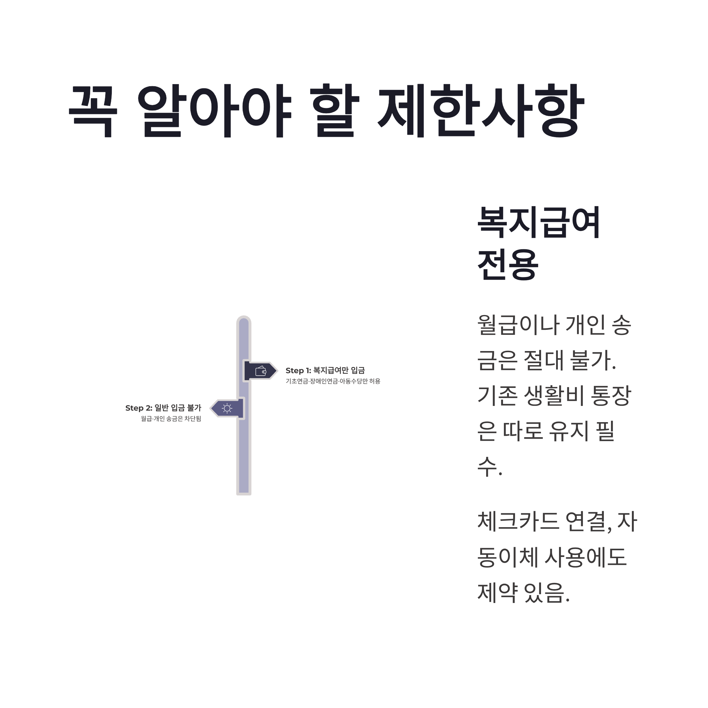 여기서 중요한 포인트 하나! 행복지킴이통장에는 복지성 급여 외 입금이 안 됩니다. 월급이나 개인 송금은 절대 불가라서, 기존 생활비 통장은 따로 유지해야 해요. 저도 이 부분 모르고 “같이 쓰면 되겠지” 했다가 직원분 설명 듣고 바로 이해했네요. 연관 키워드로 많이 검색되는 게 *압류방지통장, 복지급여 전용계좌* 이런 것들이더라구요.