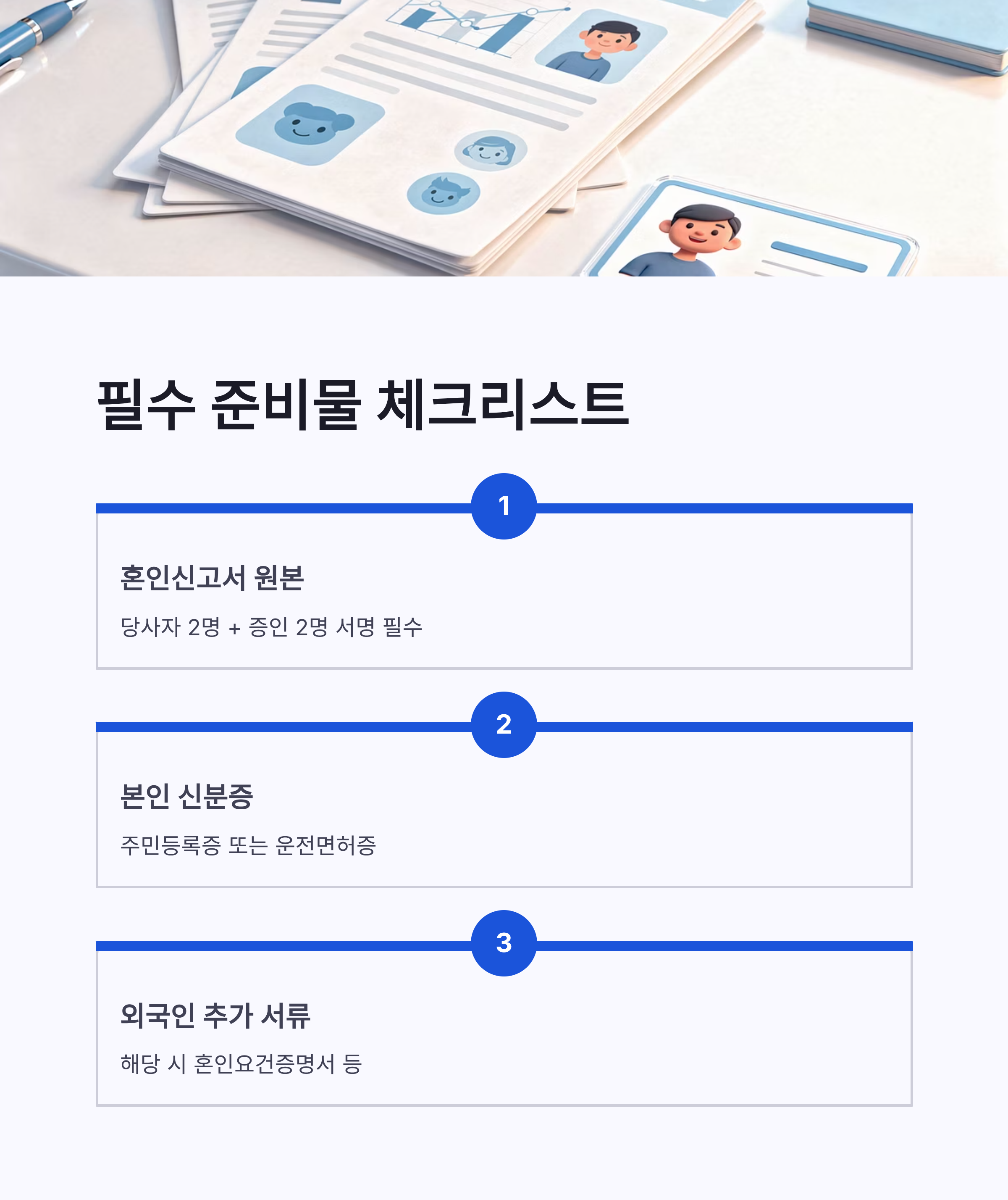 여기서 헷갈리는 포인트가 많아요. 특히 증인 서명 빠뜨리면 다시 와야 해서 진짜 귀찮아집니다 ㅠㅠ 혼자 혼인신고할 때 필요한 준비물은 아래처럼 정리하면 딱이에요.