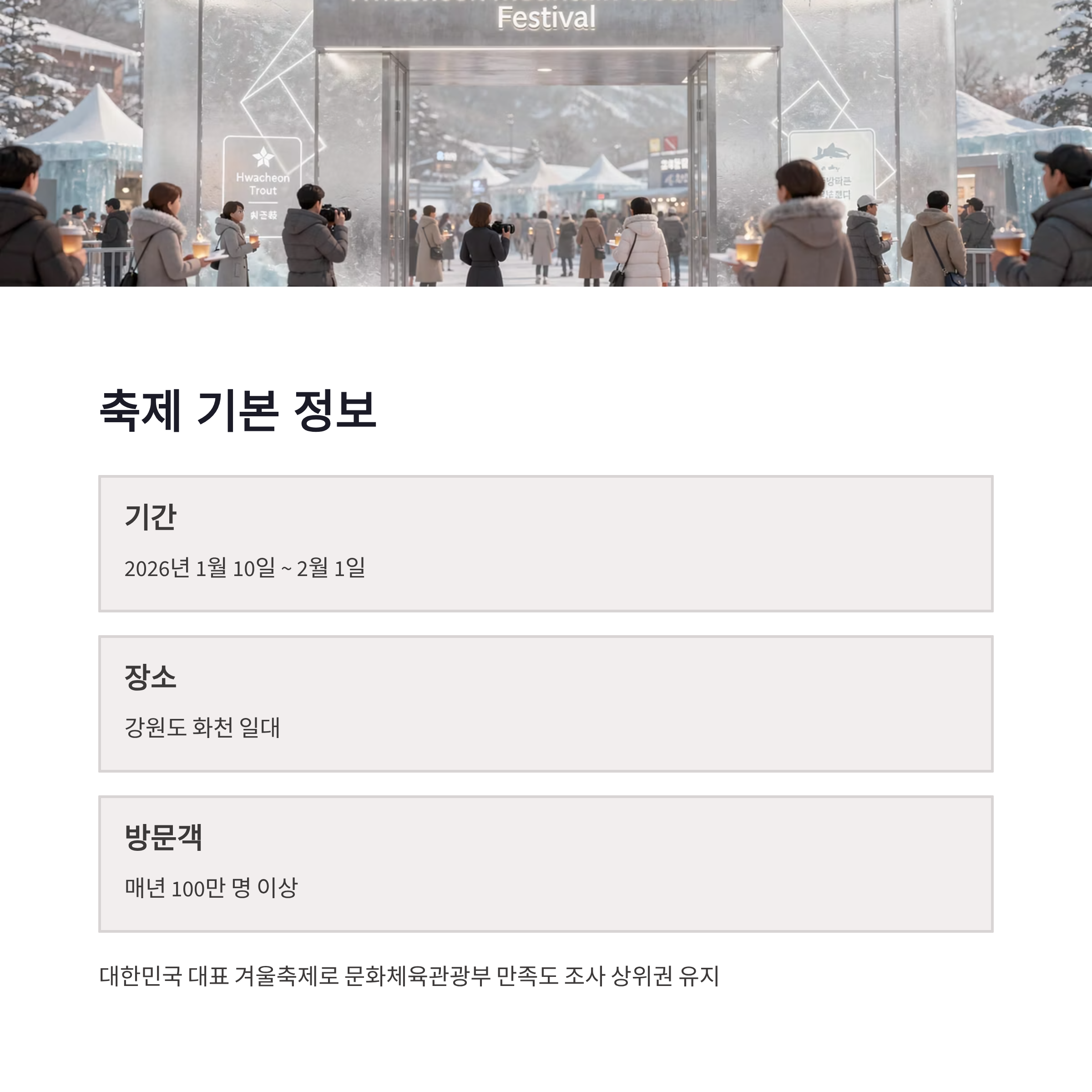 겨울만 되면 꼭 생각나는 축제가 있죠. 바로 화천 산천어축제예요. 2026년에도 어김없이 열렸고, 직접 다녀와보니 역시나 사람 많더라구요. 화천 산천어축제는 2026년 1월 10일부터 2월 1일까지 강원도 화천 일대에서 진행됩니다. 대한민국 대표 겨울축제답게 매년 100만 명 이상이 방문한다고 알려져 있는데, 2025년 기준 문화체육관광부 겨울축제 만족도 조사에서도 상위권을 유지했더라구요. 저는 주말에 갔는데, 솔직히 말해서 예매 안 했으면 줄에서 한참 서 있을 뻔했어요ㅠㅠ 미리 준비하는 게 진짜 핵심입니다.