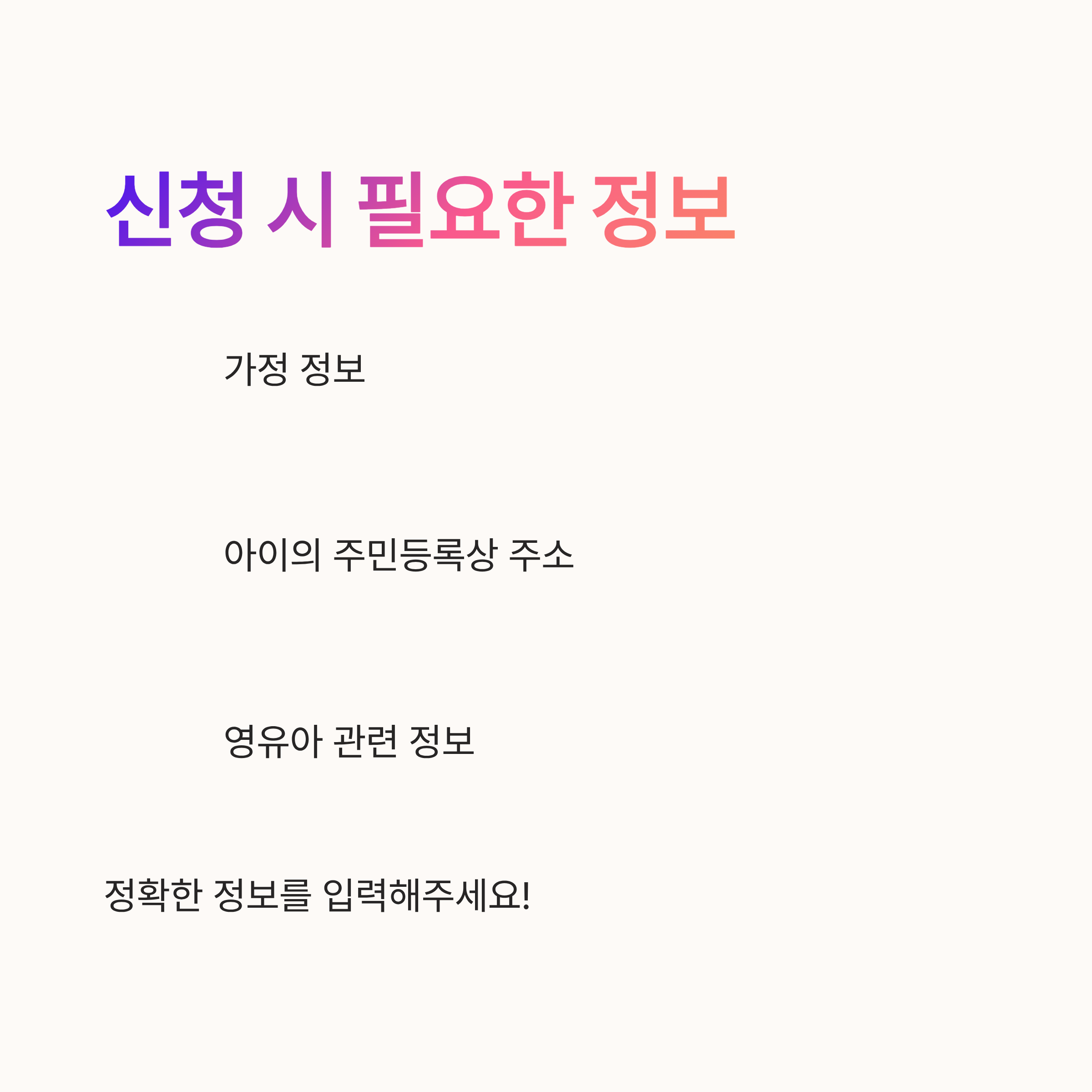 신청할 때 몇 가지 주의할 점이 있는데요. 첫째, 신청을 위해 가정 정보와 아이의 주민등록상 주소가 필요합니다. 둘째, 한 가정당 한 번의 신청이 가능하구요, 마지막으로 지원 대상은 만 6세 이하의 영유아를 둔 가정입니다. 만약 해당 연령대의 아이가 없다면 지원 대상이 아닐 수 있으니 주의하시길 바라요!