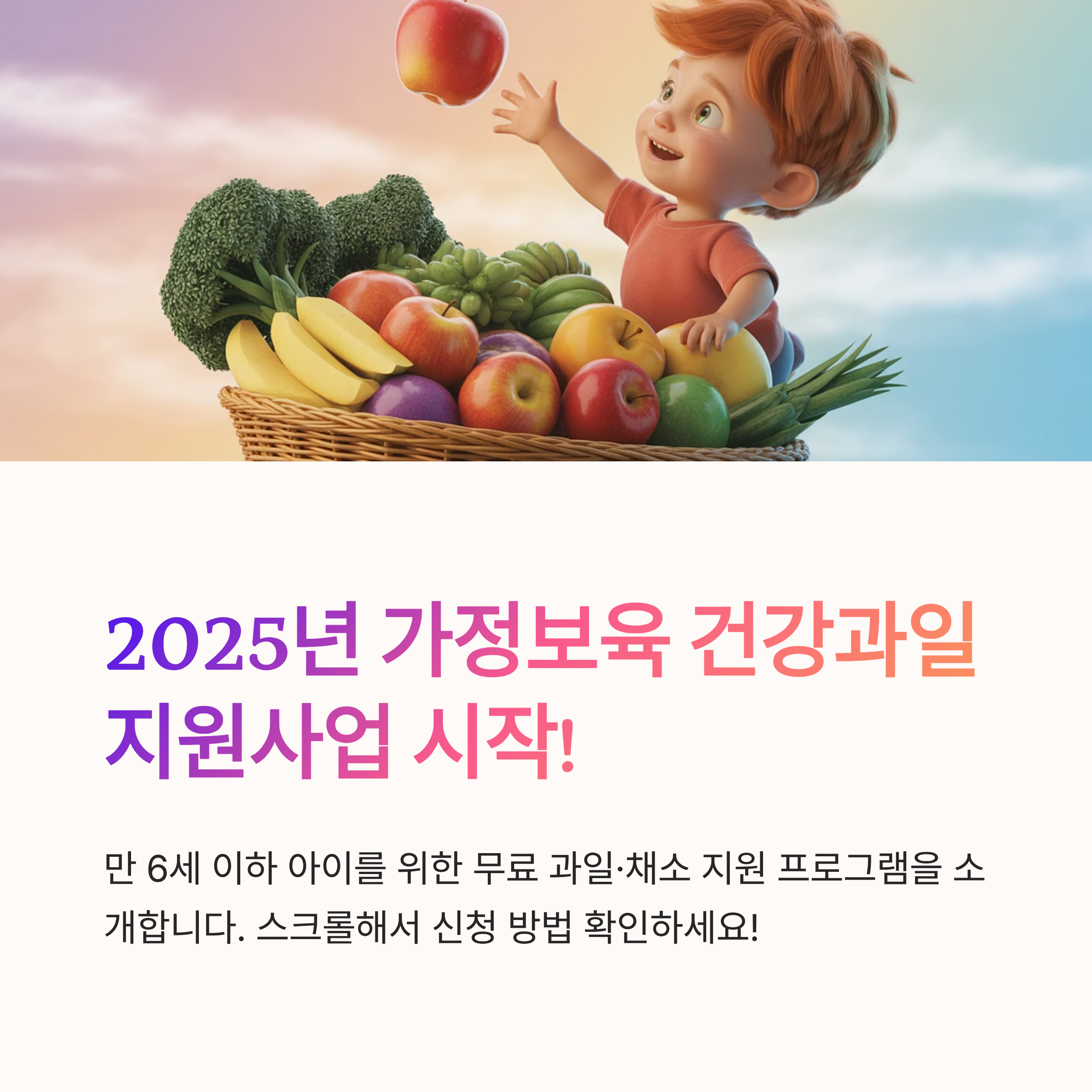 2025년이 벌써 다가오고, 새로운 해를 맞이하며 부모님들의 기대를 한 몸에 받고 있는 프로그램이 있어요! 바로 '2025년 가정보육 건강과일지원사업'입니다. 이 사업을 통해 가정에서 아이들을 돌보는 부모님들께 신선한 국내산 과일과 채소가 무료로 지원됩니다. 아이들의 영양 균형 잡기와 건강한 식습관 형성에 큰 도움이 될 것 같은데요~ 이번 블로그 포스팅에서는 이 사업의 신청 방법과 유의사항에 대해 알아보도록 할게요 😊