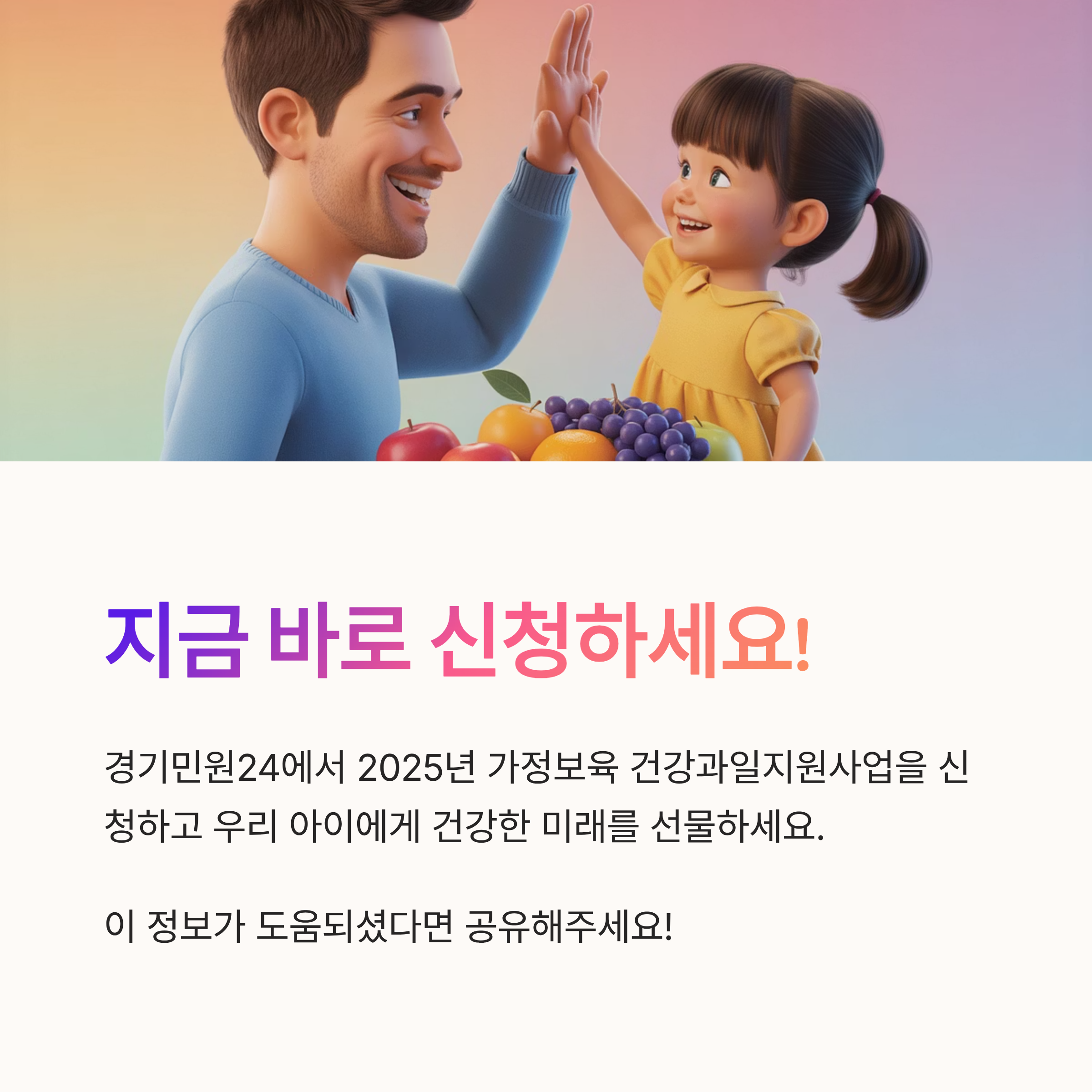 이제 모든 정보를 알았으니, 다음 할 일은 신청뿐이에요. 시간이 훌쩍 가기 전, 서둘러 '경기민원24'에서 신청을 완료하세요. 신청이 완료되면 곧 부모님들의 집으로 건강한 과일 꾸러미가 도착할 텐데요, 아이들과 함께 맛있게 즐겨보세요! 🎉