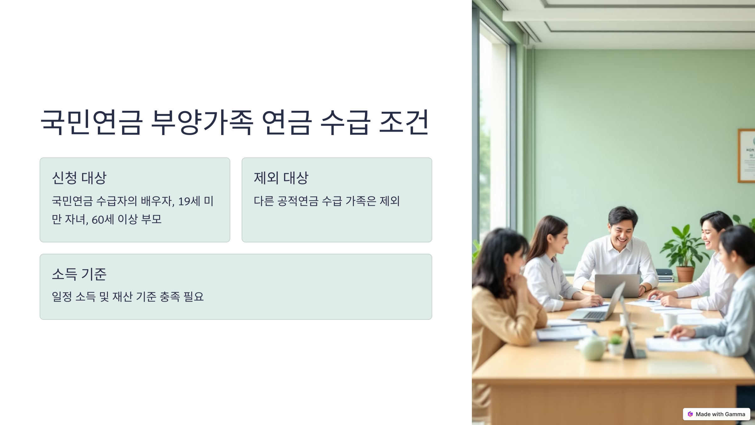 - 부양가족 연금을 받기 위해서는 일정 소득 및 재산 기준을 충족해야 합니다.