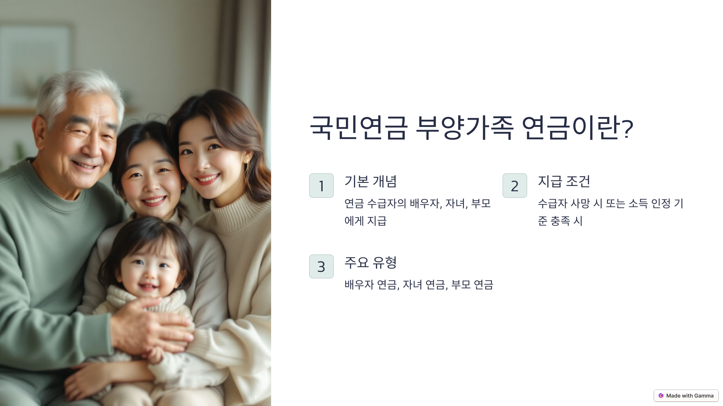 - 국민연금 수급자가 사망한 경우 남은 가족이 연금을 받을 수 있음