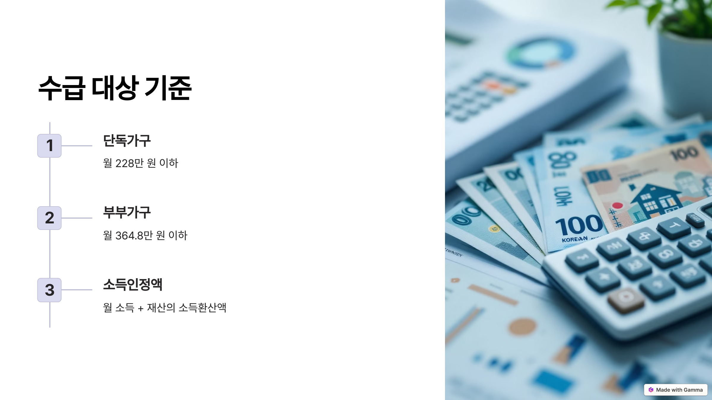 | 단독가구 | 월 228만 원 이하 |