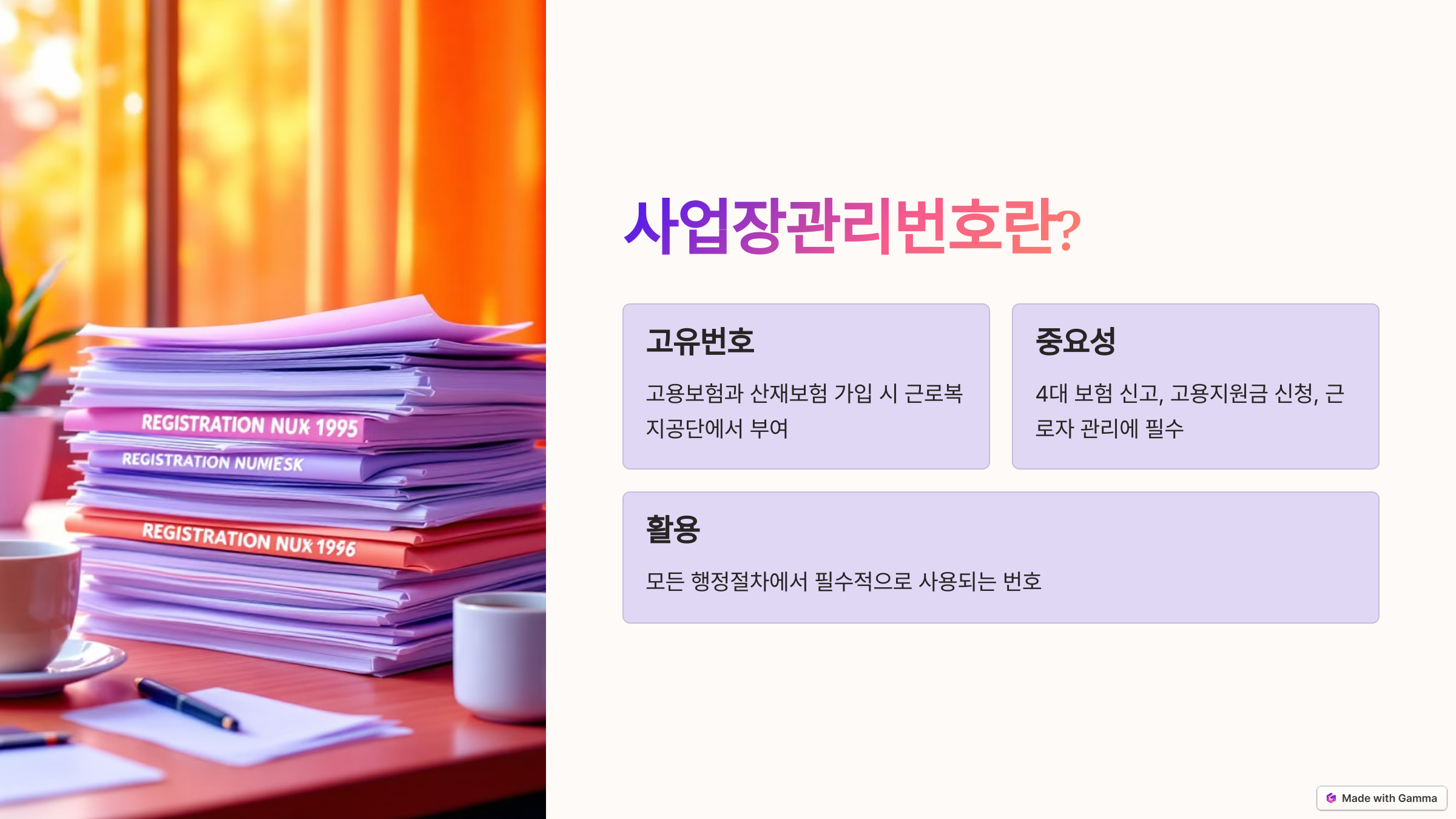즉, 사업주가 근로자를 고용하면서 발생하는 모든 행정절차에서 필수적으로 사용되는 번호라고 보면 됩니다.