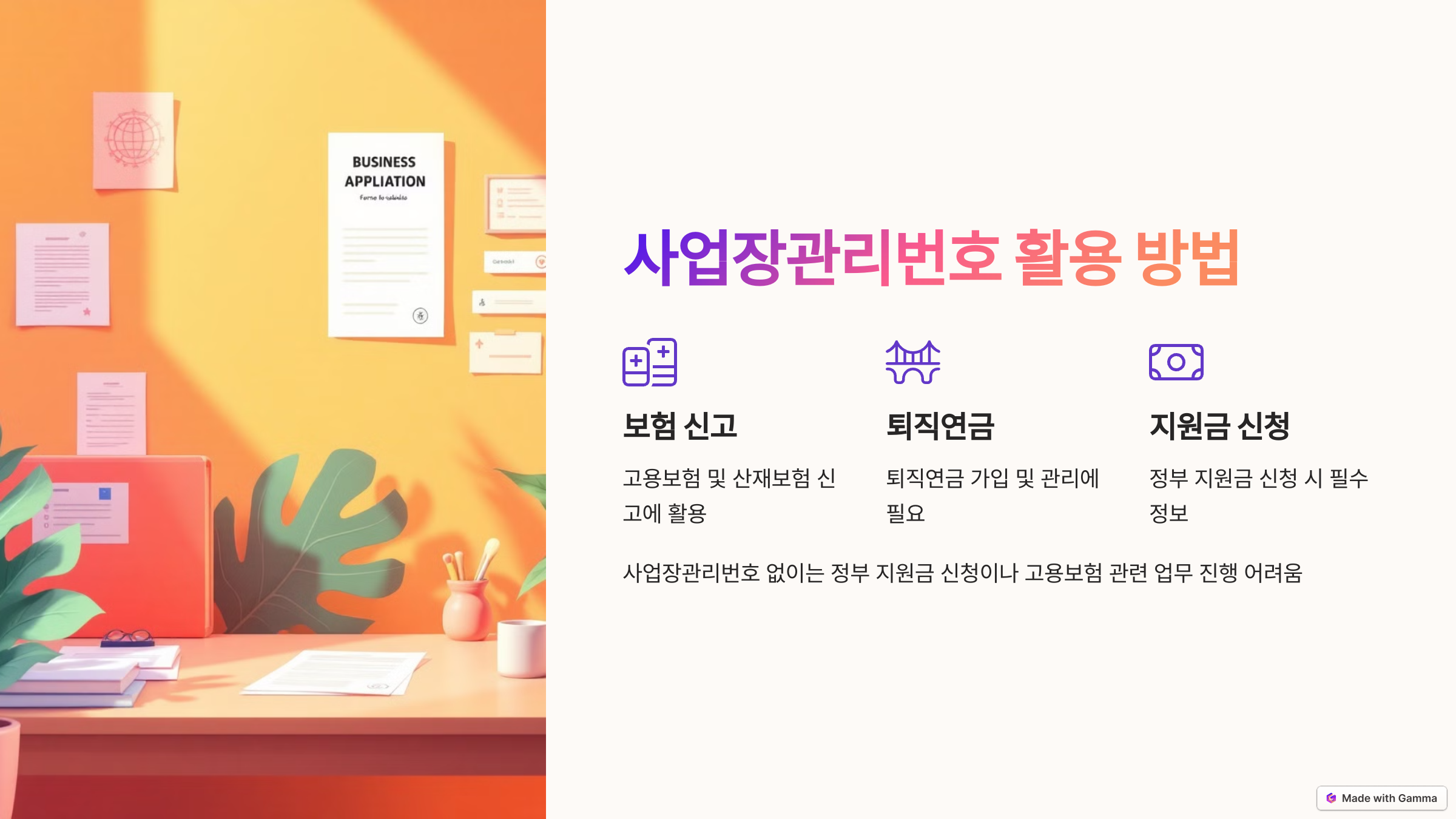 ✔ 사업장관리번호는 고용보험, 산재보험 가입 및 정부 지원금 신청 등에 반드시 필요