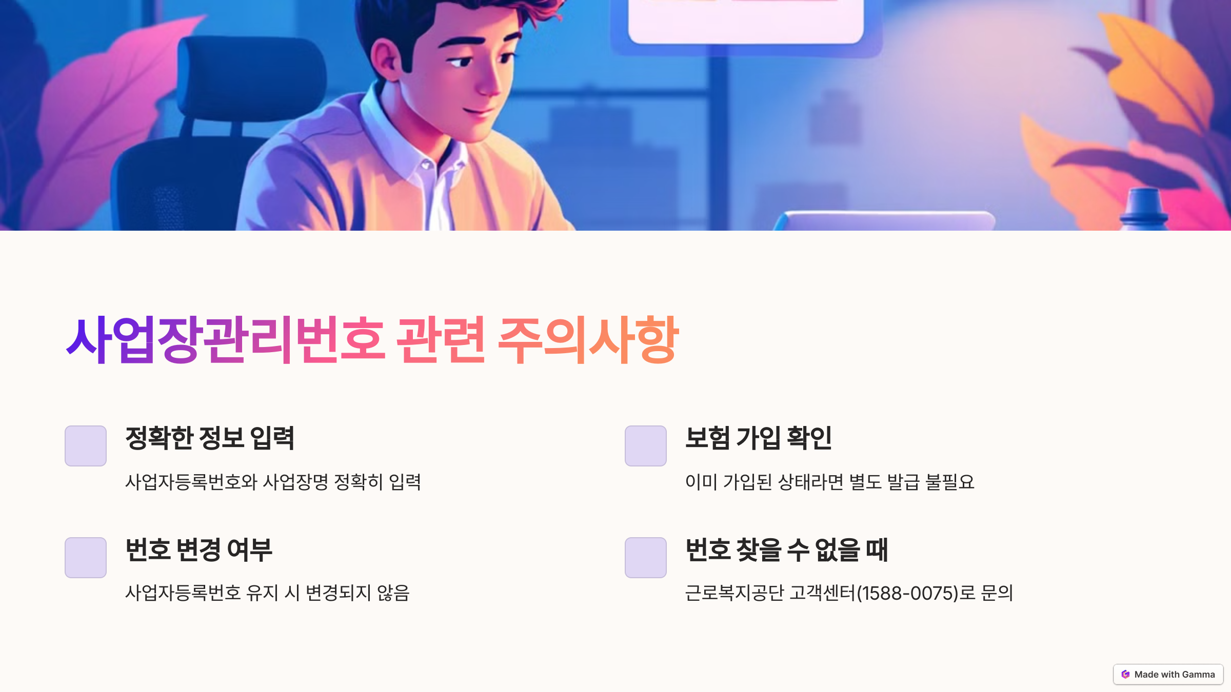 ✔ 신규 사업장은 근로복지공단 홈페이지에서 사업장 가입 신청 후 번호 발급 가능