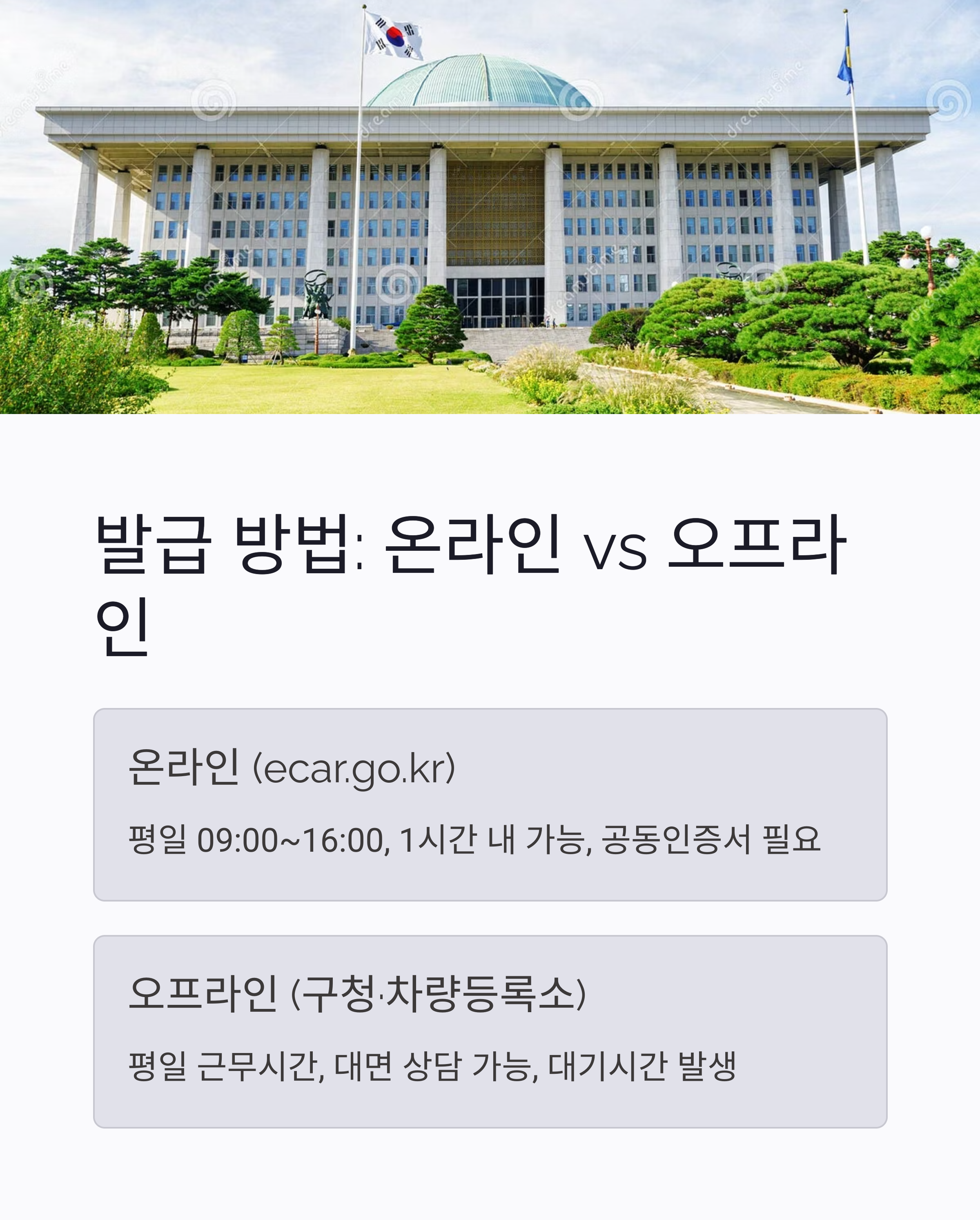 | 온라인 (ecar.go.kr) | 자동차민원 대국민포털 | 평일 09:00~16:00 | 빠르고 간편, 집에서도 가능 | 인증서 필요, 서류 스캔 필요 |