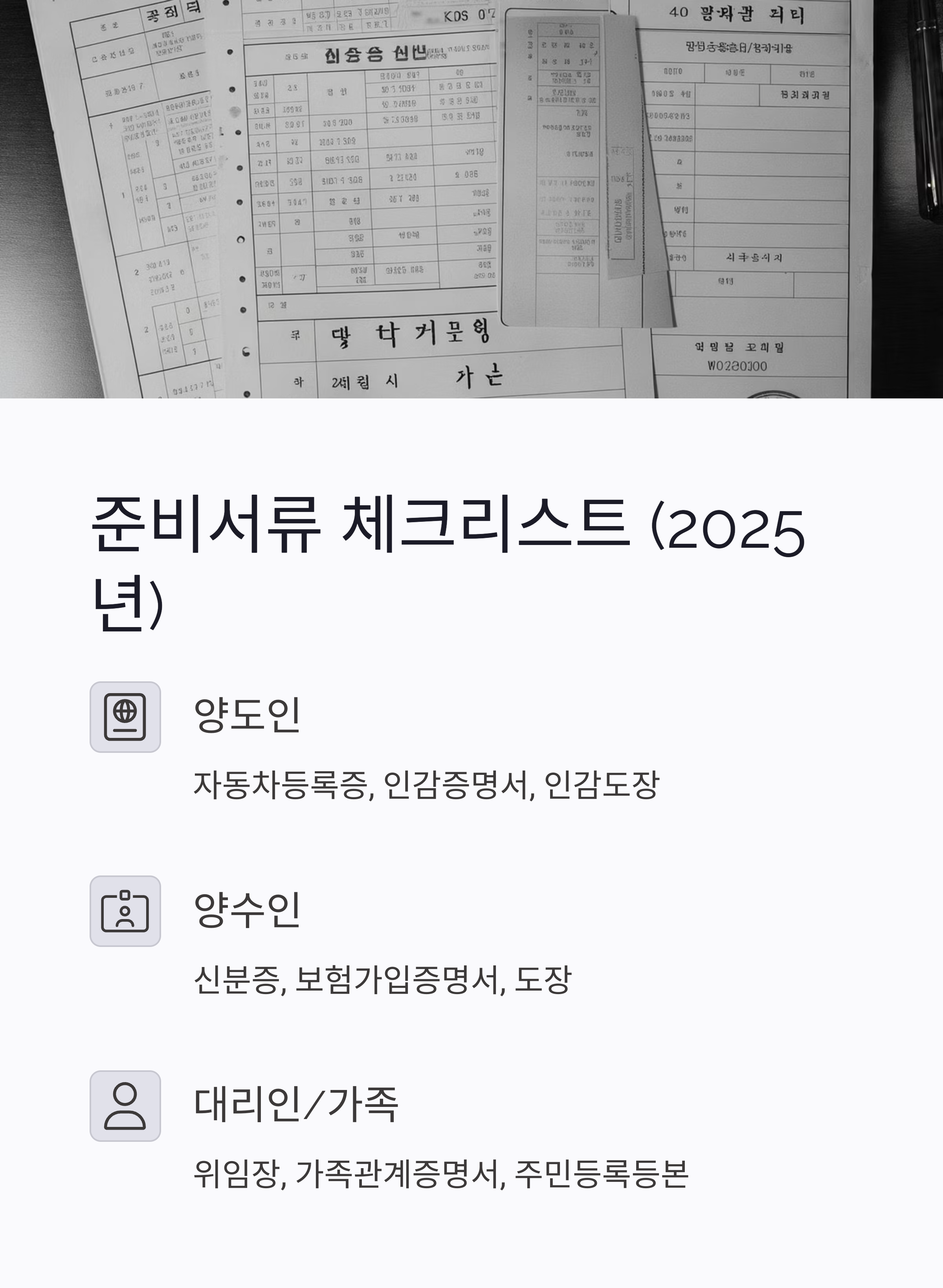 | 공통 | 양도증명서, 이전등록신청서 | 차량등록소 서식 비치 or 다운로드 |