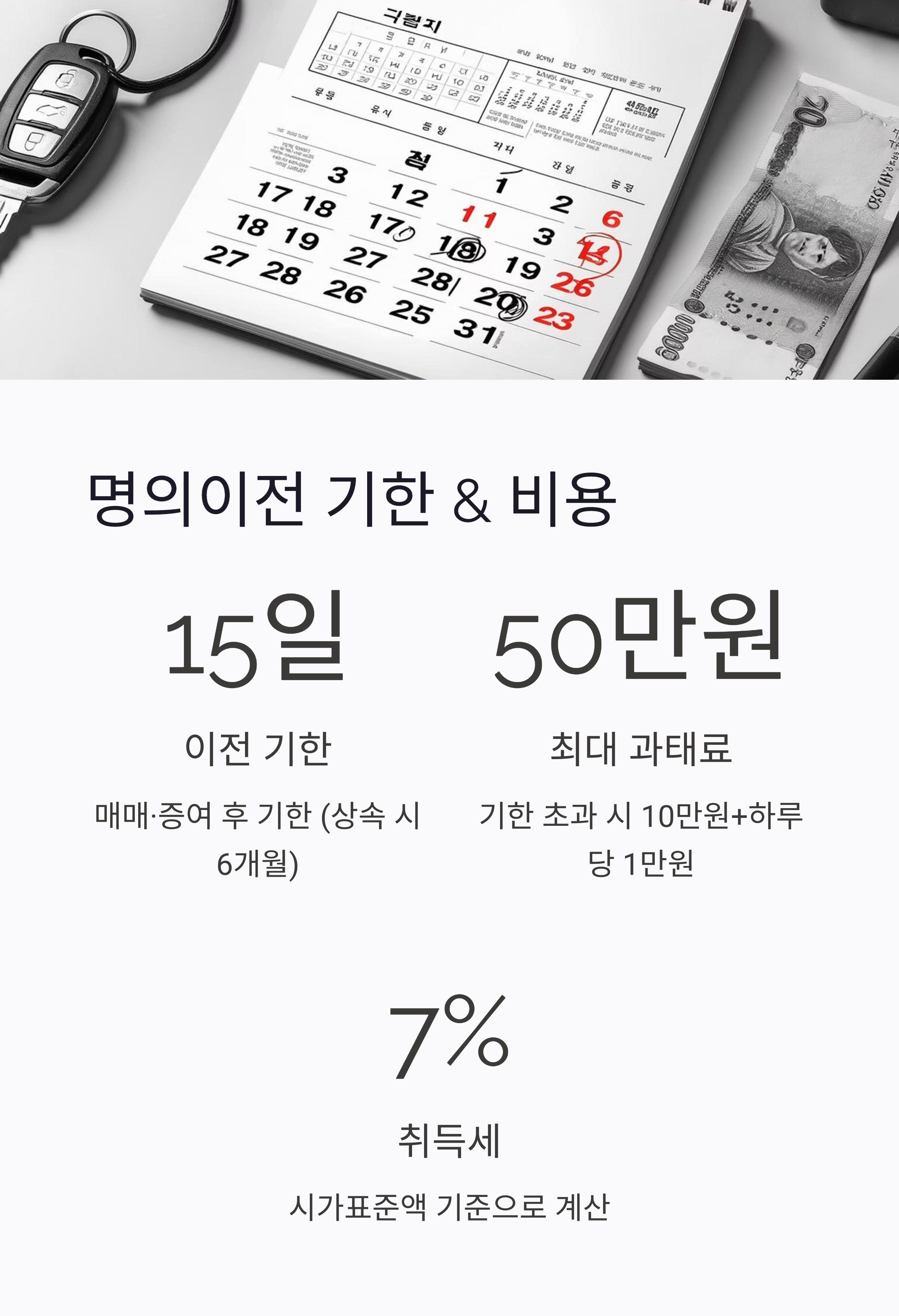 | 명의이전 기한 | 매매·증여 후 15일 이내 / 상속 시 6개월 이내 |
