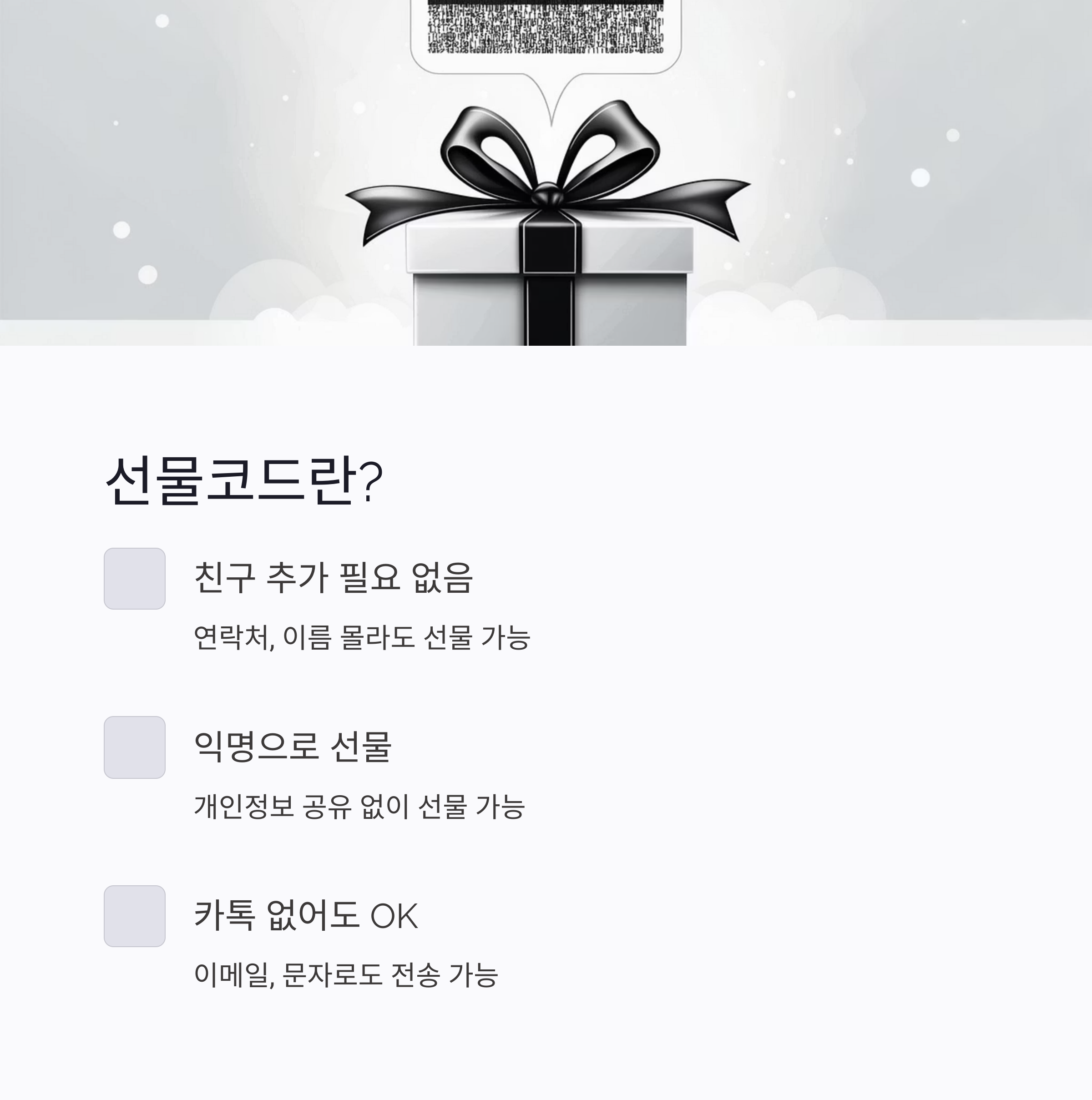 | 익명 선물로 개인정보 보호 | 상품별로 ‘선물코드’ 지원 안 되는 경우 있음 |
