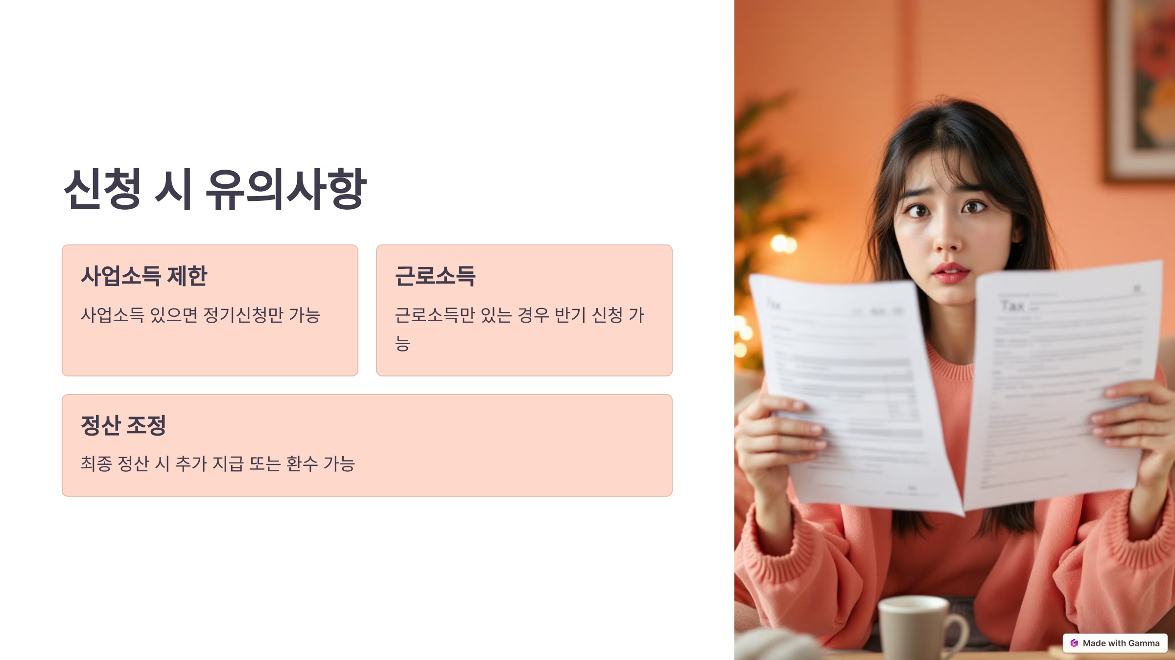 - 반기 신청자는 사업소득이 없어야 함 (사업소득 있는 경우 정기신청 필요)