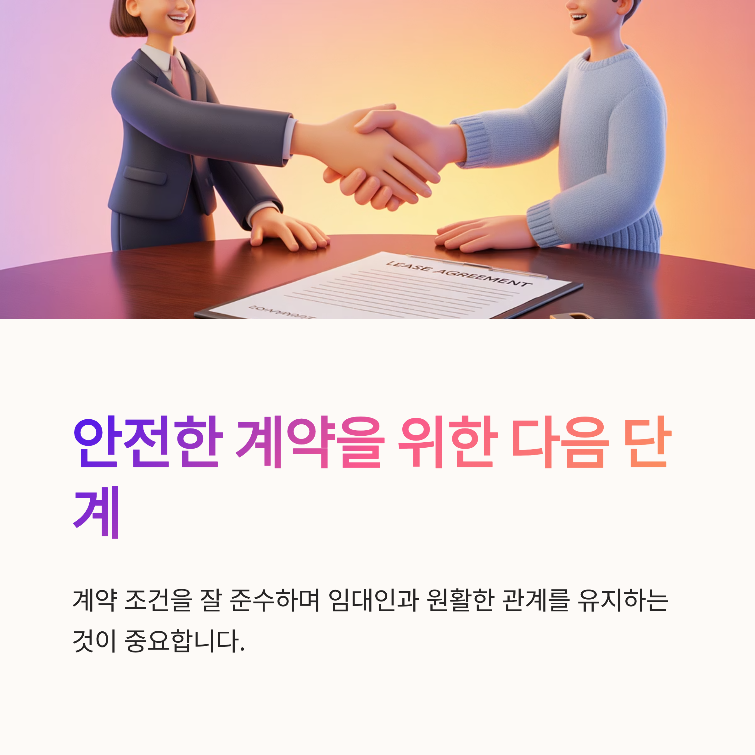 계약서 작성이 완료되었고, 그 이후 절차까지 마무리했네요. 자 이제부터는 실제 이사 및 생활이 시작되겠죠! 하지만 여기서 끝이 아니에요. 꾸준히 계약조건을 잘 준수하면서도 임대인과 원활한 관계를 유지하는 것이 무엇보다 중요하답니다🙂 계약 조건을 잘 지키면서, 새로운 보금자리에서 행복한 생활을 즐기시기를 바라요!