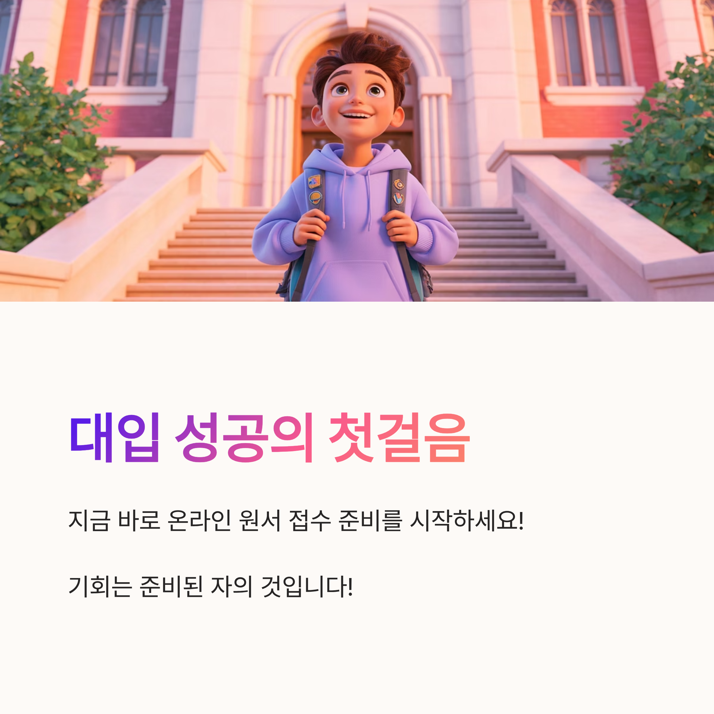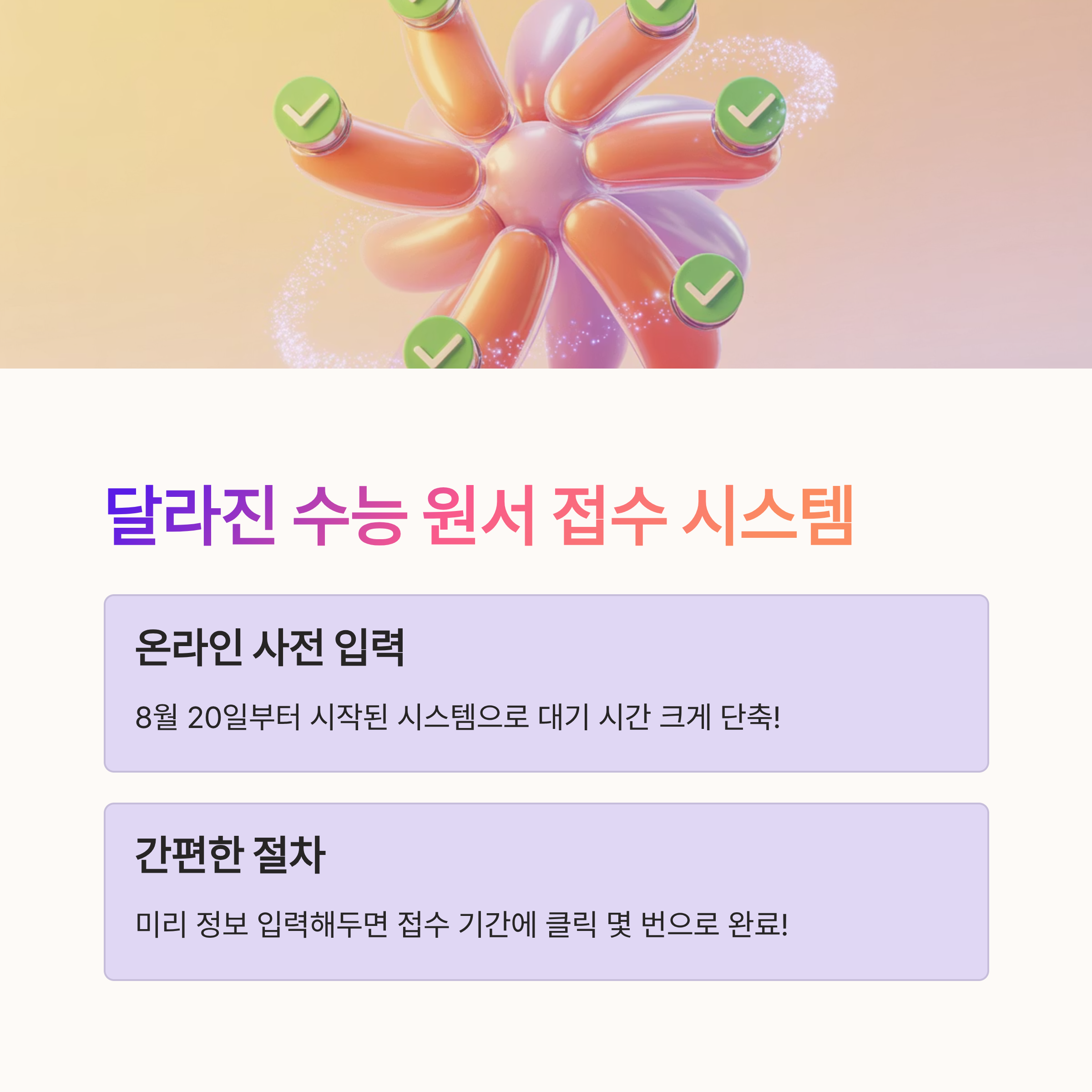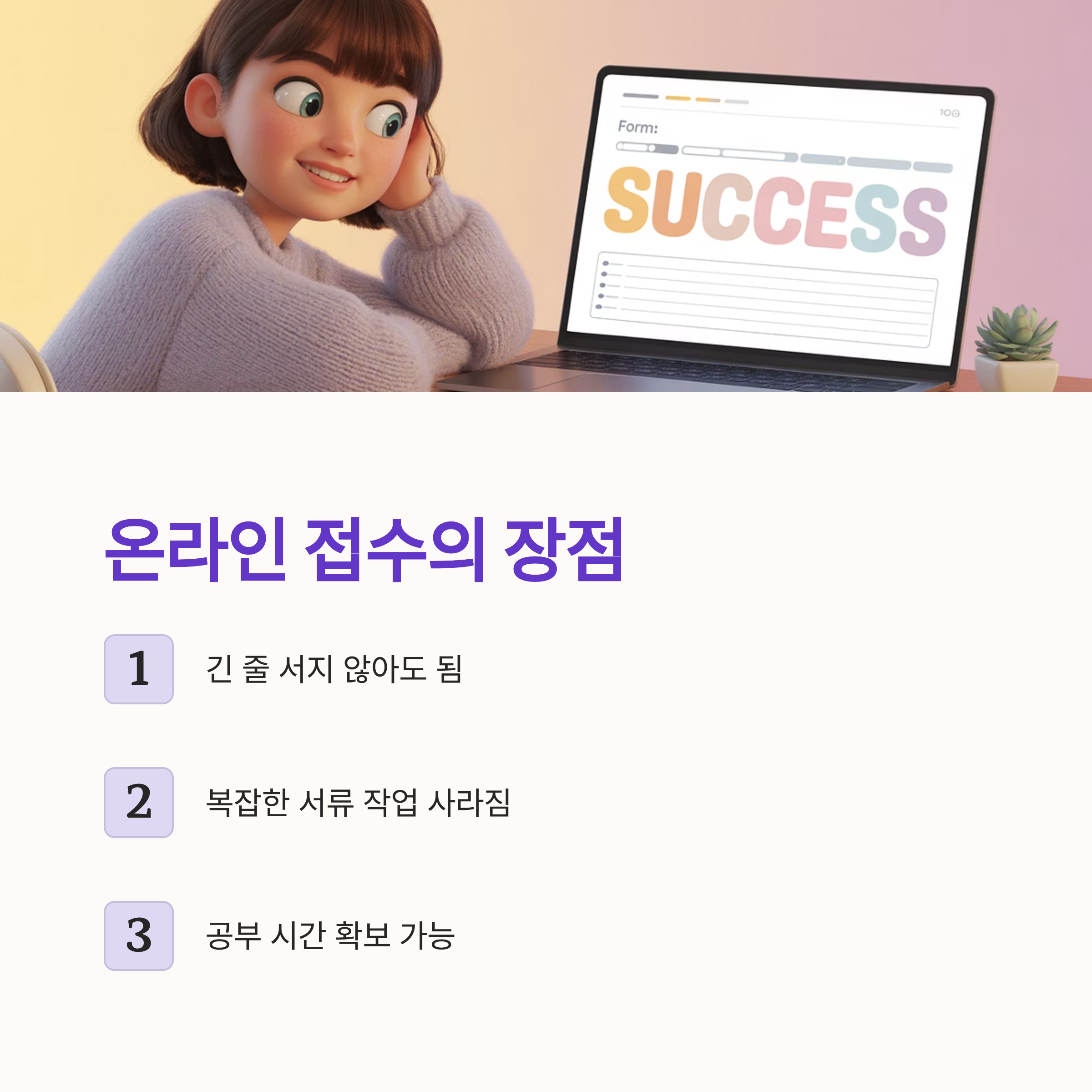 이제 온라인 접수로 더 이상 긴 줄을 서지 않아도 되고, 복잡한 서류 작업도 사라졌어요. 덕분에 시간도 많이 세이브 되고, 여러분은 공부 시간 더 늘릴 수 있게 되겠죠~🕒