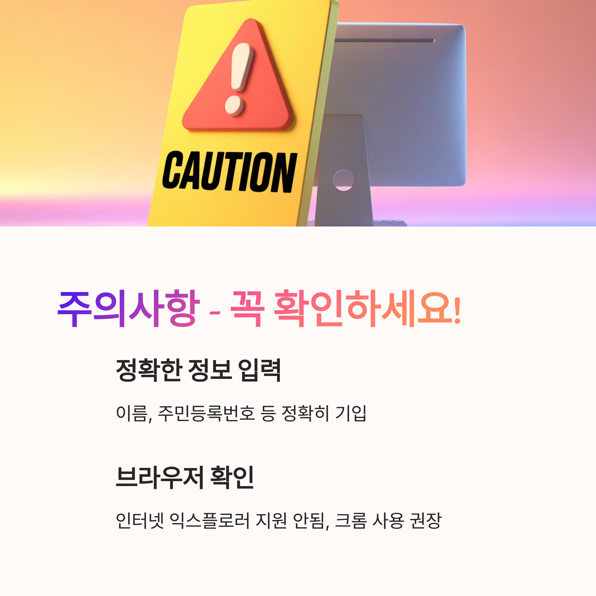 - 주의사항: 긴장하지 마세요! 정보 입력 시 이름, 주민등록번호 등 정확한 내용을 기입해야 해요. 실수하면 큰일 나는 거 아시죠?