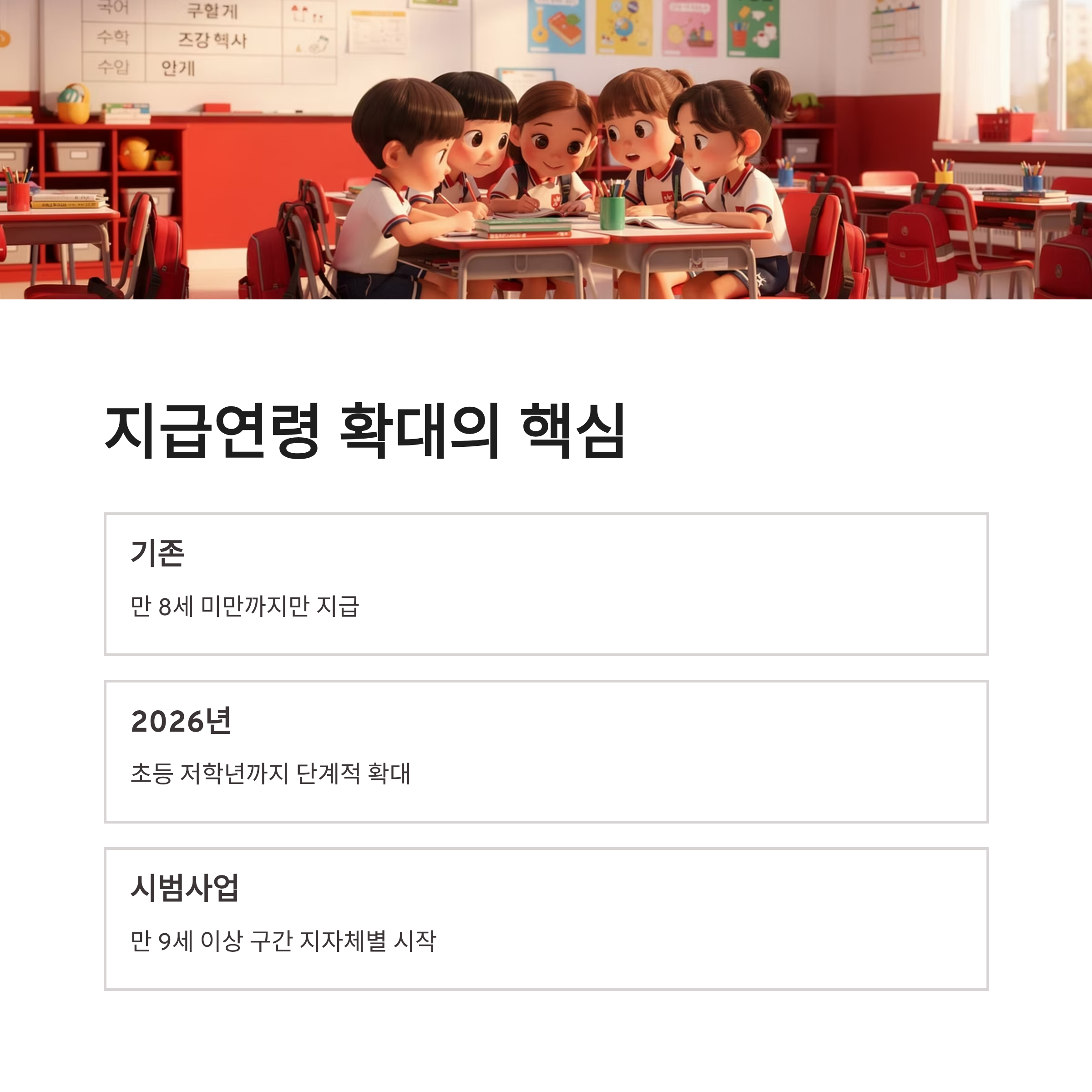 _x000D__x000D_ 2026년을 앞두고 아동수당 확대 소식 들으면서 저도 바로 계산기부터 두드렸어요 ㅎㅎ 그만큼 체감이 큰 변화라서요. 가장 큰 포인트는 지급연령 상향입니다. 기존에는 만 8세 미만까지만 지급되던 구조였는데, 2026년부터는 초등 저학년까지 단계적 확대되는 방향으로 정리되고 있어요._x000D__x000D_ 2025년 보건복지부 정책 자료 기준으로, 만 9세 이상 구간을 포함하는 방안이 지자체 시범사업 형태로 먼저 시작됐구요. 아동수당 확대 덕분에 학원비, 급식비 부담이 슬슬 늘어나는 시점에 숨통이 트이는 느낌이랄까요. 솔직히 말하면 “이제야 현실 반영했네…” 이런 생각도 들었구요. 아동수당 확대는 단순한 복지가 아니라, 생활비 구조 자체를 조금 바꿔주는 역할을 하더라구요._x000D__x000D_ _x000D__x000D_