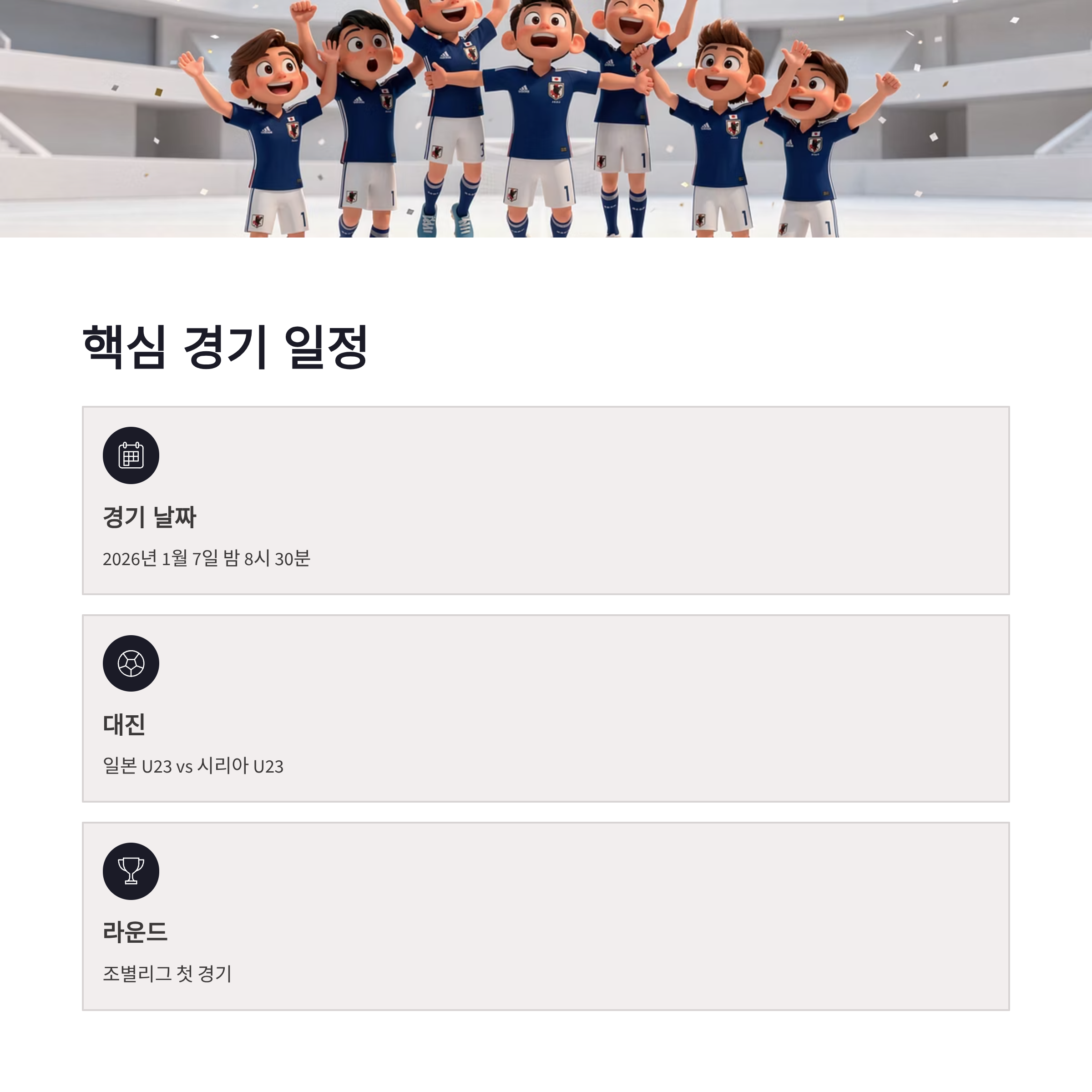 2026 AFC U23 일본 아시안컵 중계 기다리던 날이 드디어 왔구요. 2026년 1월 7일 밤 8시 30분, 조별리그부터 빅매치가 딱 걸렸습니다. 상대는 만만치 않은 시리아. 일본은 늘 그렇듯 우승 후보로 거론되고 있고, 시리아는 수비 조직력 하나는 진짜 끈질긴 팀이라서요. 솔직히 말하면 전력만 보면 일본이 앞서는데, 이런 경기에서 꼭 변수 한 방씩 나오잖아요 ㅎㅎ 그래서 더 눈이 가더라구요. 2026 AFC U23 일본 아시안컵 중계는 조별리그부터 긴장감이 꽤 높은 편입니다. 저도 일정 확인하자마자 알람부터 맞춰놨네요.