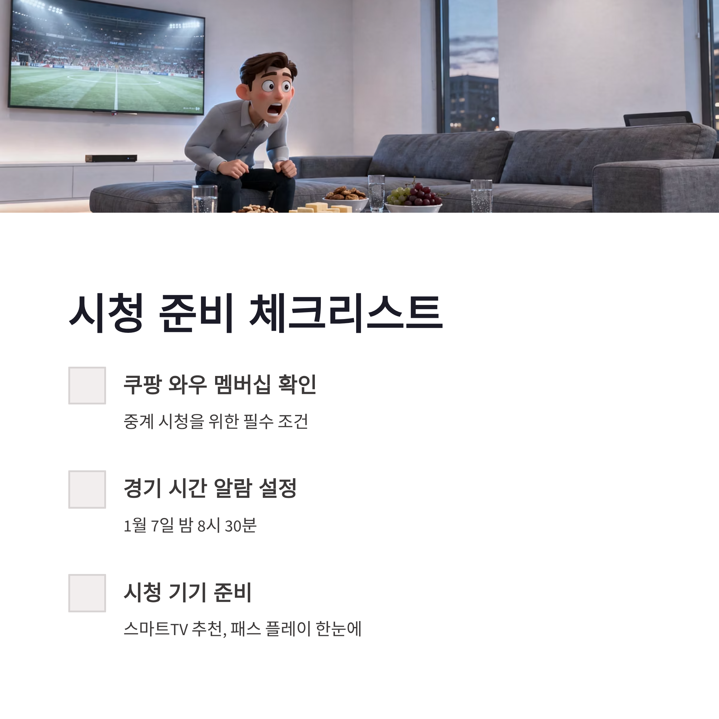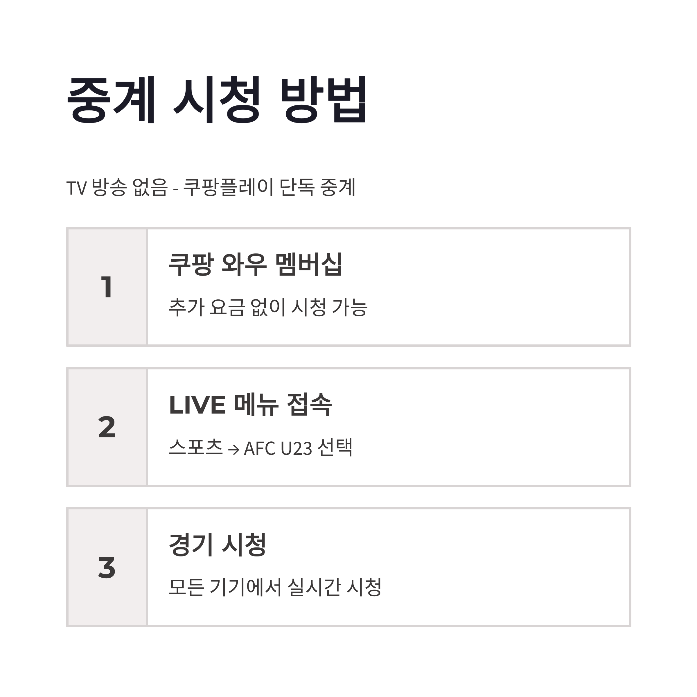 이번 2026 AFC U23 일본 아시안컵 중계는 TV로는 안 나옵니다. 이게 제일 헷갈리는 포인트인데요, 중계는 쿠팡플레이 단독이에요. 와우 멤버십만 있으면 추가 요금 없이 바로 시청 가능하구요. 모바일, PC, 태블릿, 스마트TV 전부 지원돼서 환경은 꽤 편한 편입니다.