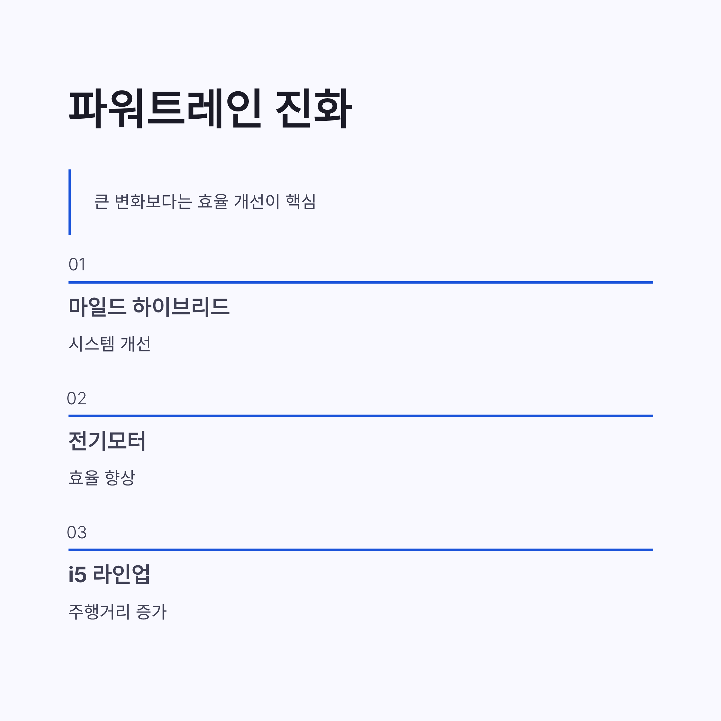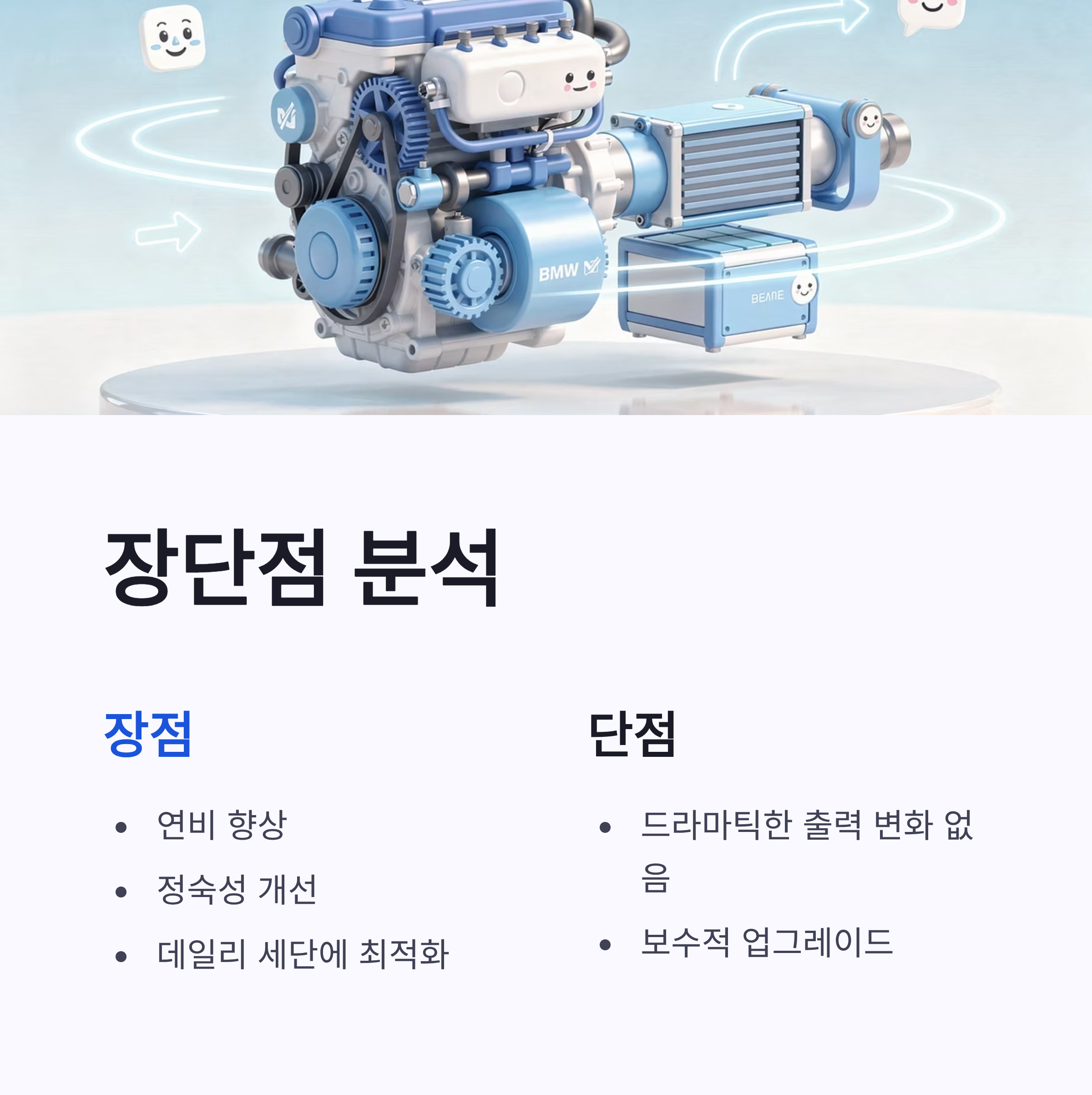 장점은 연비·정숙성 향상, 단점은 드라마틱한 출력 변화는 없을 수 있다는 점… 그래도 데일리 세단으로는 이게 더 맞는 선택 같더라구요.