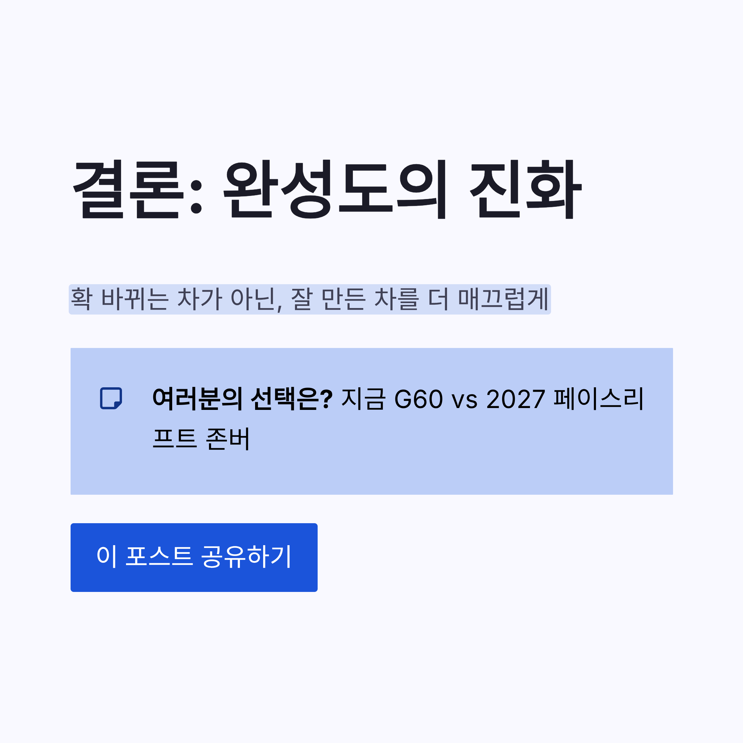 정리해보면 2027년 BMW 5시리즈 페이스리프트는 확 바뀌는 차는 아닙니다. 대신 디자인 정제, 실내 UX 개선, 파워트레인 효율 업… 이 삼박자가 핵심이에요. 이미 잘 만든 차를 더 매끈하게 다듬는 느낌이라, 현행 G60 고민 중인 분들이라면 LCI까지 기다릴지 진짜 고민될 듯하네요 ㅎㅎ