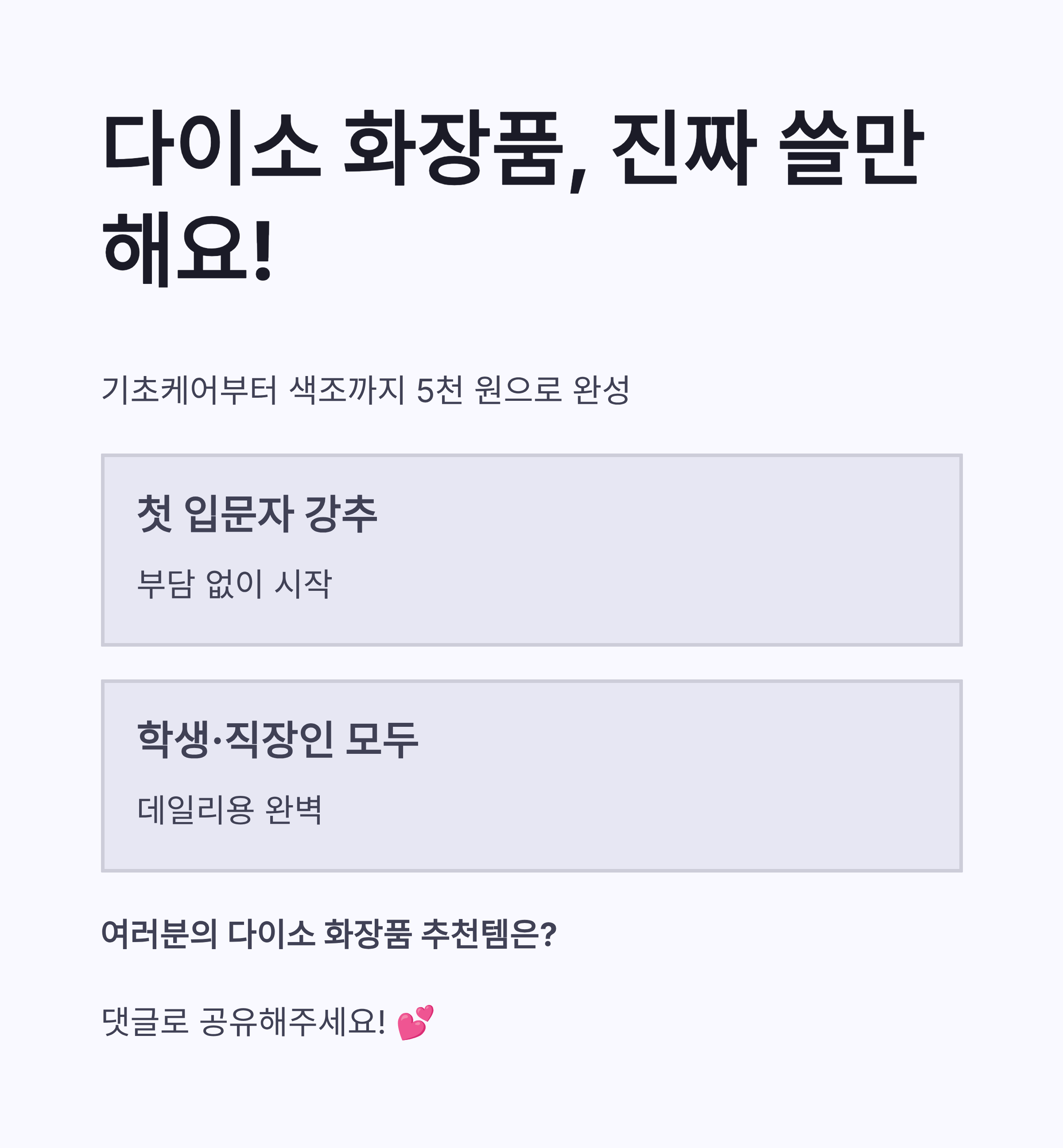 다들 다이소 화장품 5천 원 이하로 예뻐질 수 있다면 믿겠쥬?ㅋㅋ 진짜 요즘 SNS에서 난리인 다이소 뷰티템들, 가격 착한데 품질도 꽤 괜찮아서 다이소 화장품 추천 많이 보셨을 거에요! 기초부터 색조, 뷰티툴까지 풀라인업 가능해서 가성비 뷰티템 찾는 학생, 직장인까지 완전 좋아한다구요. 이번 글에서는 제가 직접 써보고 느낀 다이소 화장품 추천템을 리얼 후기 기반으로 정리했어요! 입문자도 부담 없이 써볼 수 있는 리스트라 진짜 좋아요ㅎㅎ