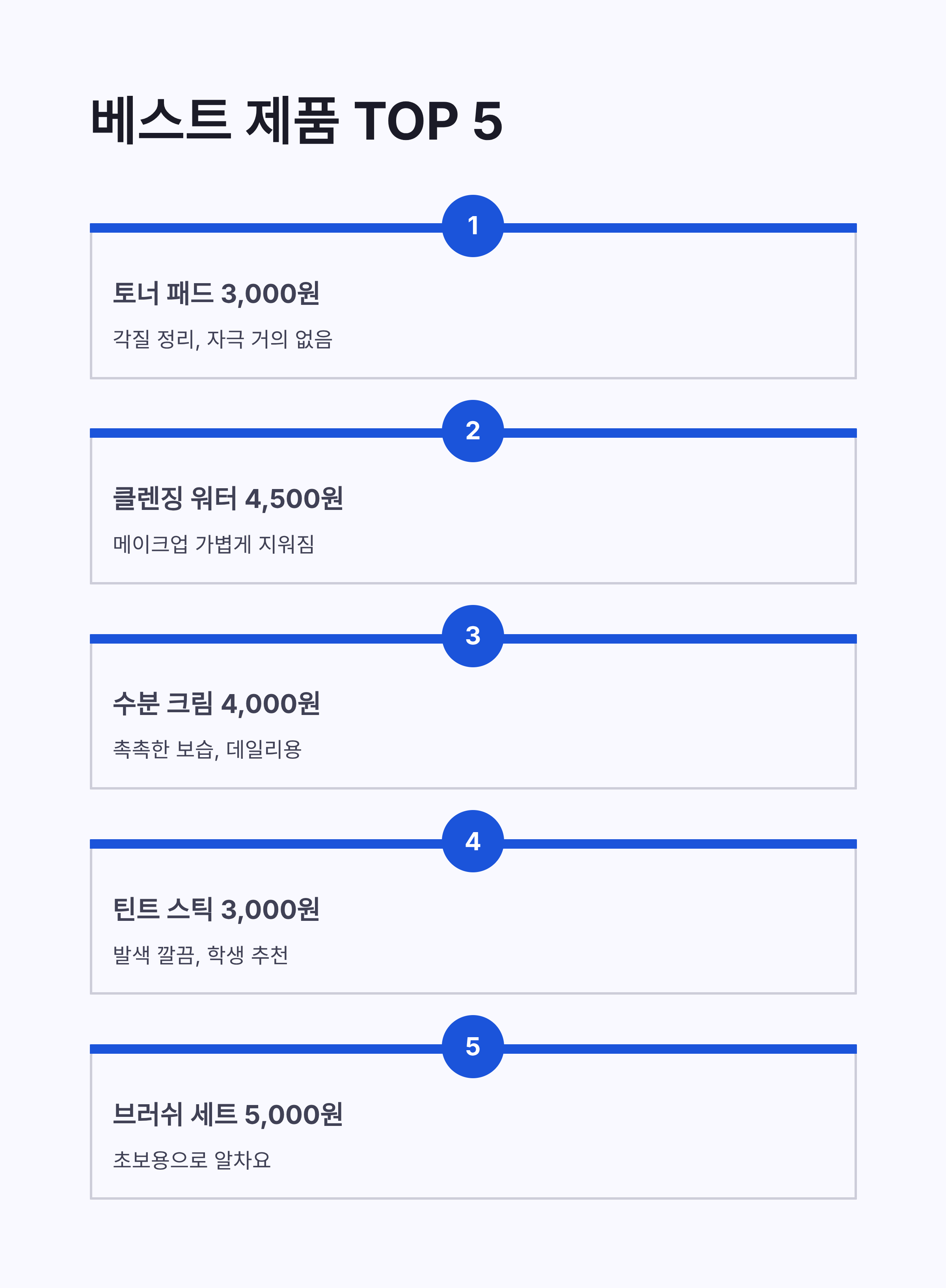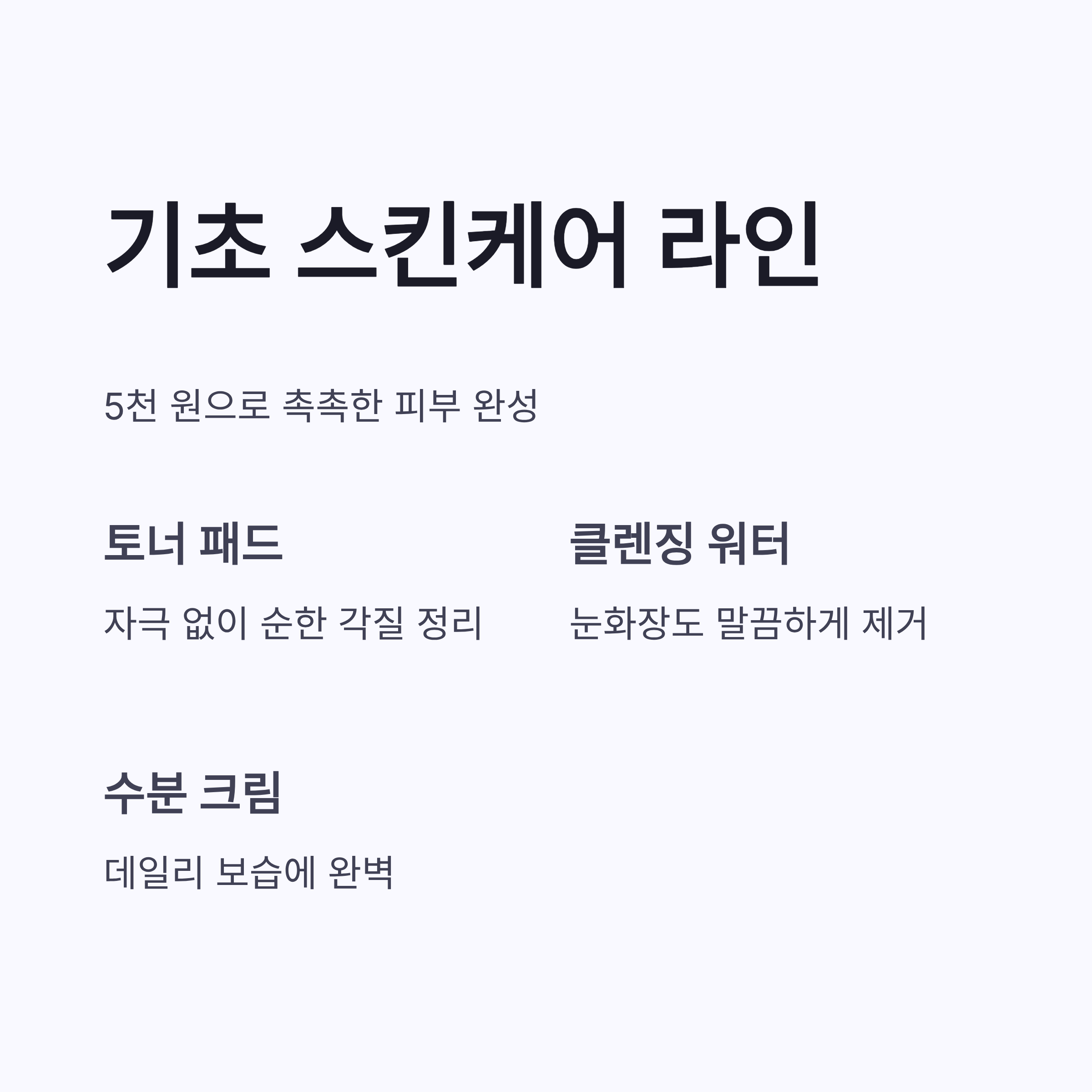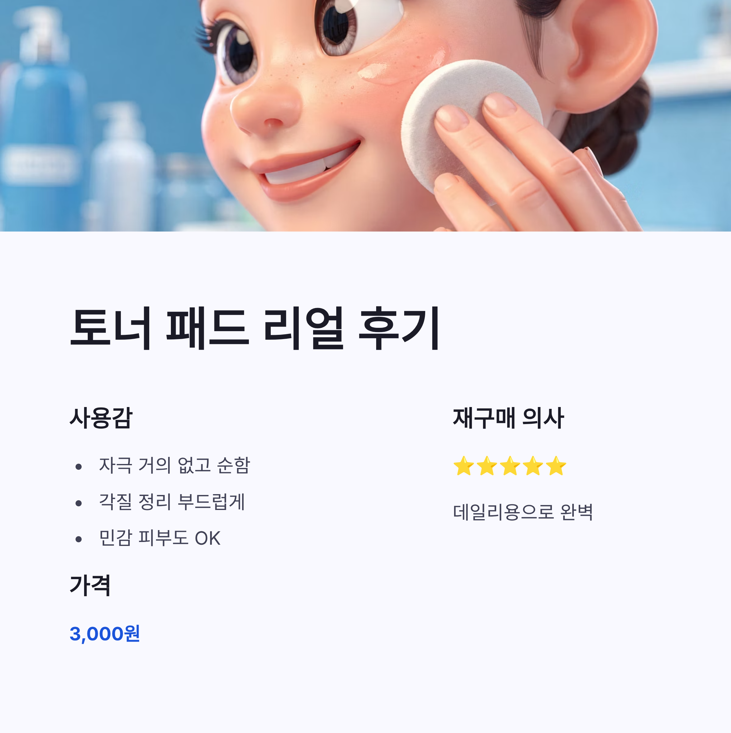 | 토너 패드 | 각질 정리 | 3,000원 | 자극 거의 없고 순함 |