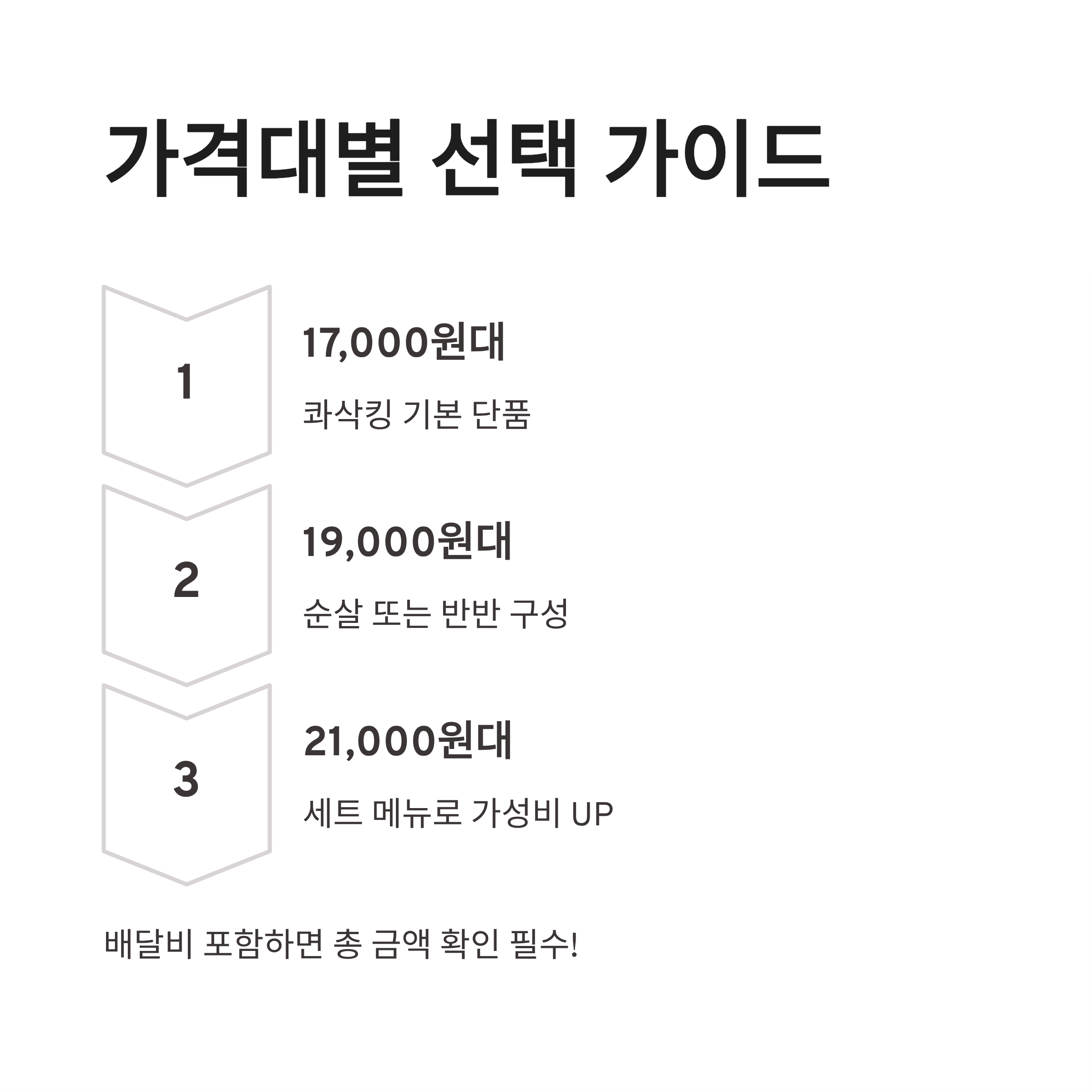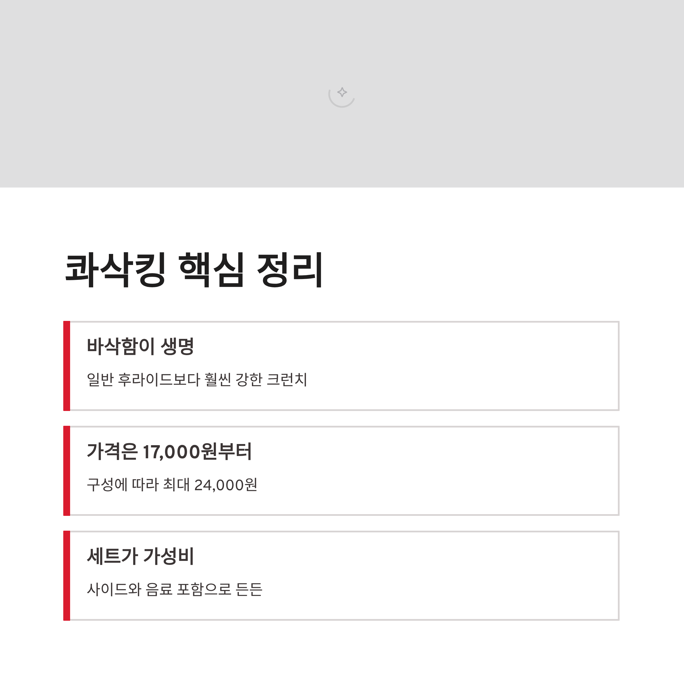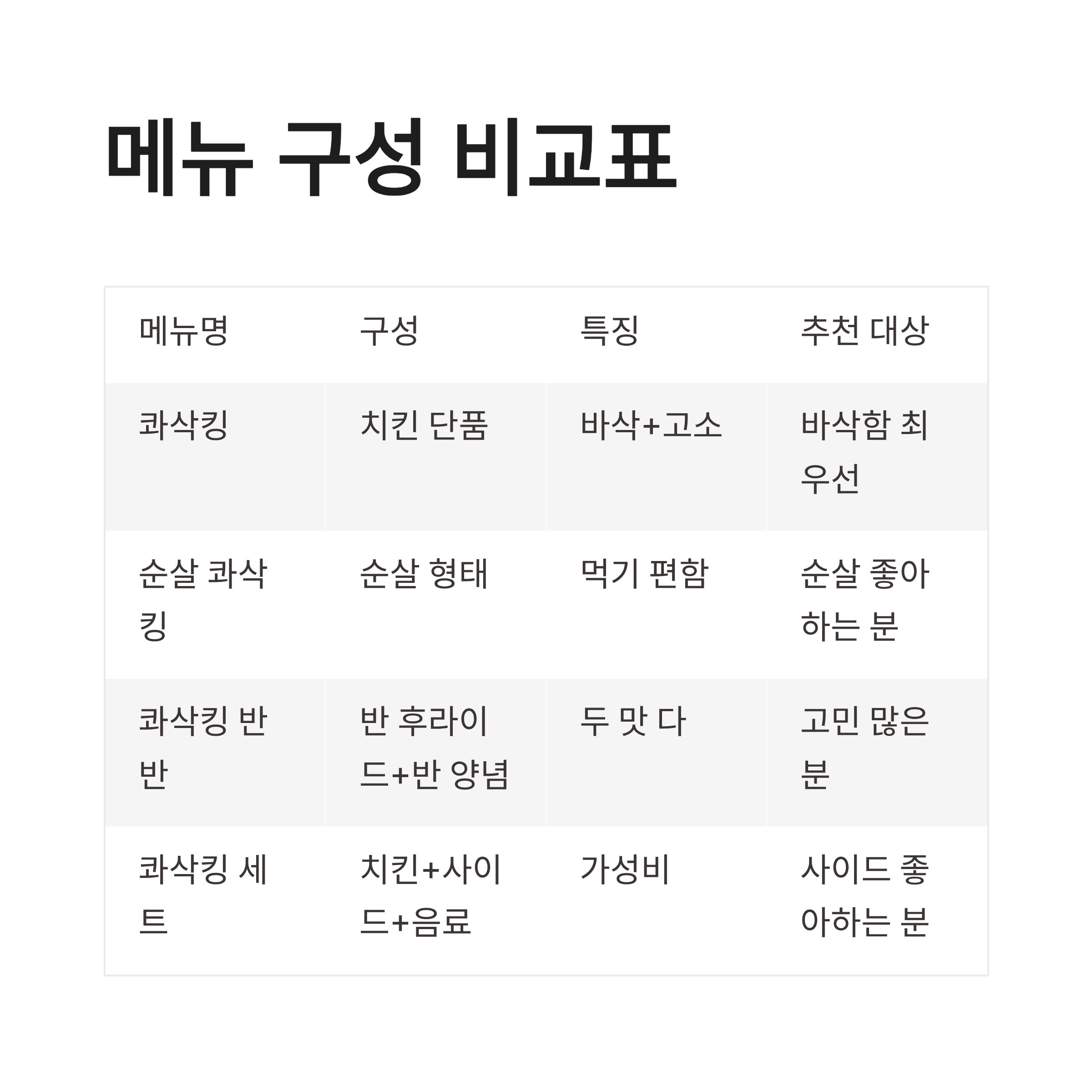 | 콰삭킹 세트 | 치킨 + 사이드 + 음료 | 가성비 | 사이드 좋아하는 분 |