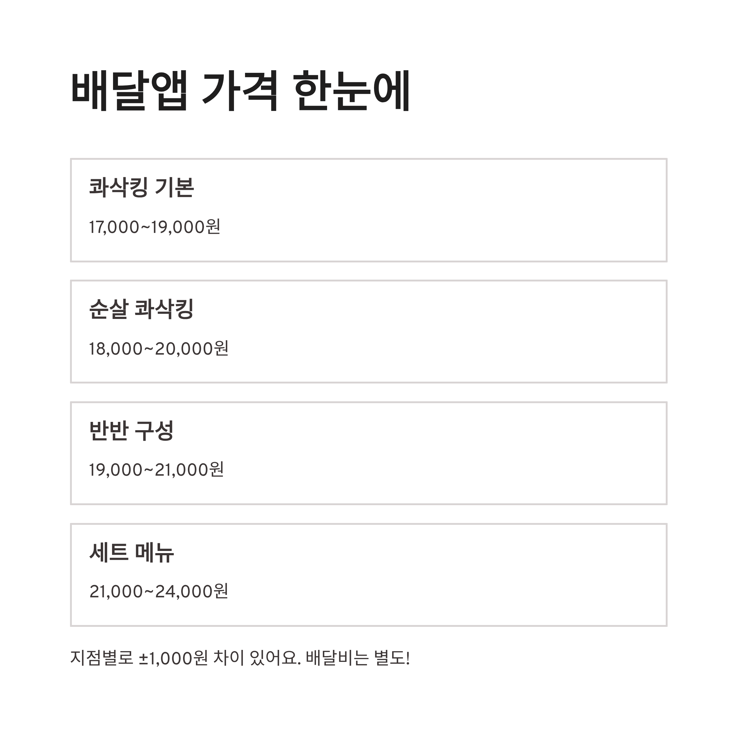 요즘 BHC 콰삭킹 치킨 자주 시켜 먹는데요, 배달앱마다 가격이 조금씩 다르긴 해요. 지점별로 오르내림은 있지만 대부분 비슷한 범위라서 초보분들도 참고하기 좋아요. 배달비는 따로 붙어요! • 콰삭킹 (후라이드 스타일) – 약 17,000원~19,000원 • 콰삭킹+순살 – 약 18,000원~20,000원 • 콰삭킹 반반 (후라이드+양념) – 약 19,000원~21,000원 • 콰삭킹 세트 (치킨+감자튀김/콜라) – 약 21,000원~24,000원 지점 혹은 배달비에 따라 ±1,000원 정도 차이 날 수 있어요! 진짜 바삭함 원하는 사람에게는 딱이에요!!