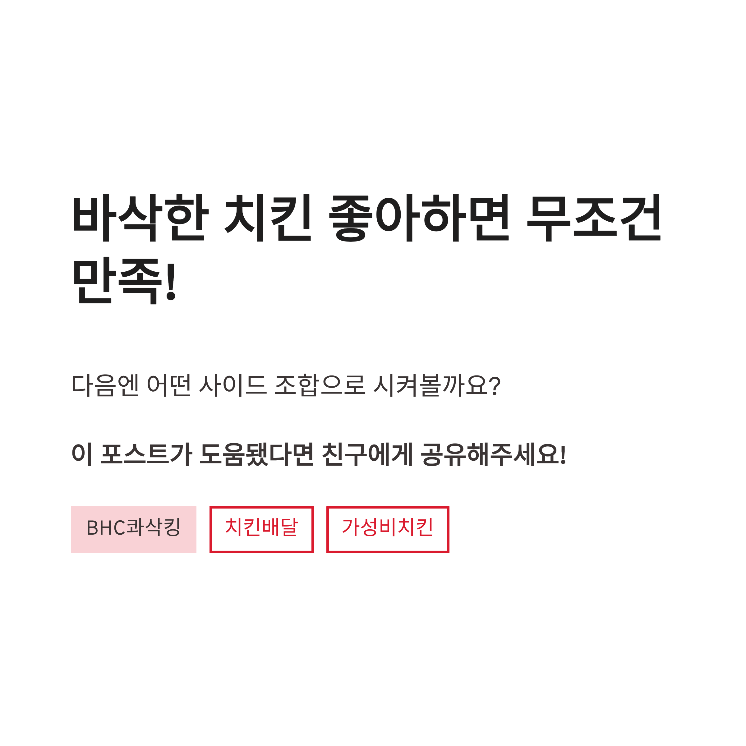 BHC 콰삭킹은 일반 후라이드보다 바삭함이 핵심! 배달앱 가격은 17,000원대 시작으로 구성에 따라 조금씩 올라가고, 세트 구성으로 시키면 사이드·음료 포함이라 더 든든해요. 바삭한 치킨 좋아하면 무조건 만족! 다음엔 어떤 사이드 조합으로 시켜볼까용?