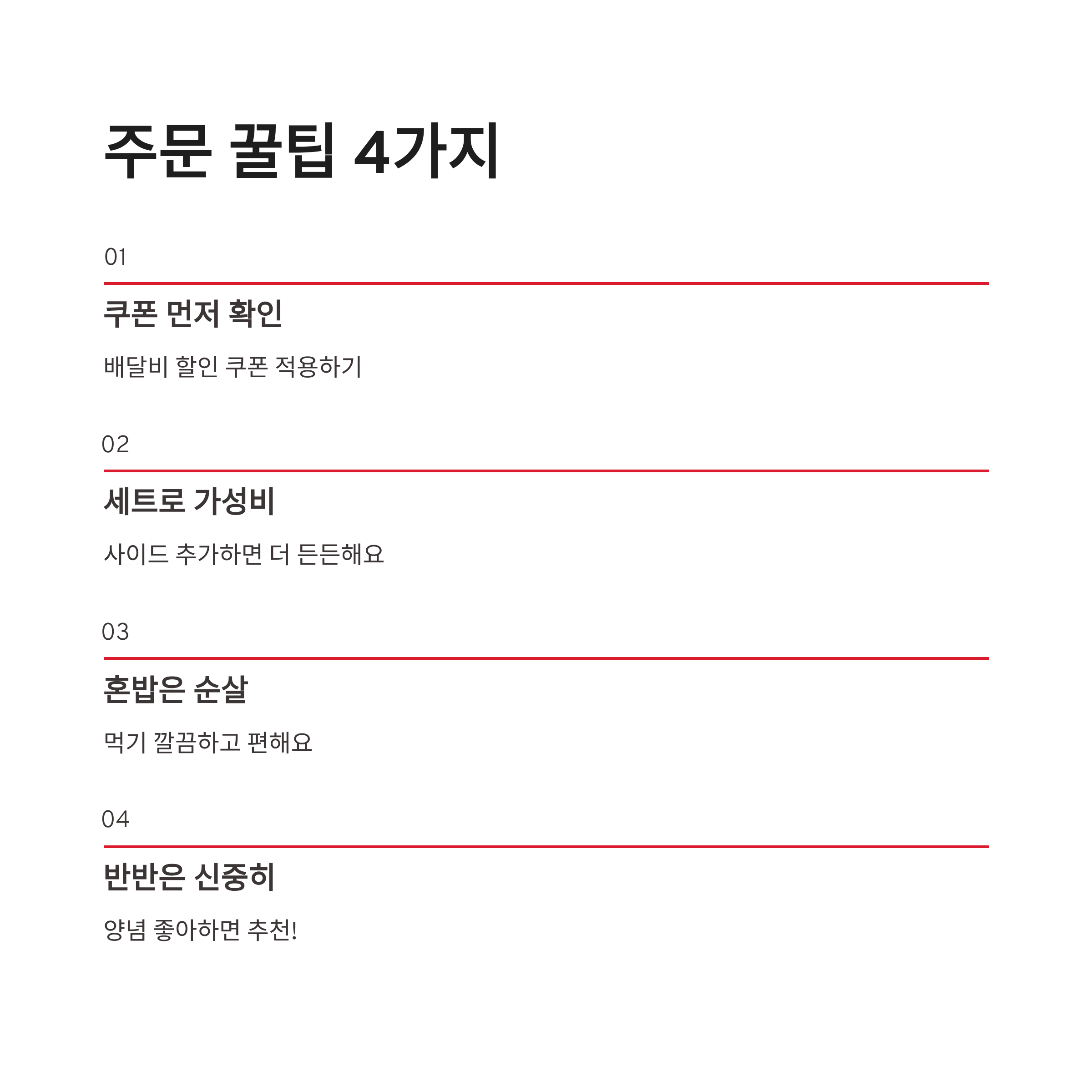 • 배달비 할인 가능한 쿠폰 먼저 적용하기 • 사이드(감자튀김/콜라) 추가하면 가성비 좋아요 • 혼밥이라면 순살로 시키면 먹기 깔끔해요 • 반반은 호불호 갈릴 수 있어요! 양념 좋아하면 OK