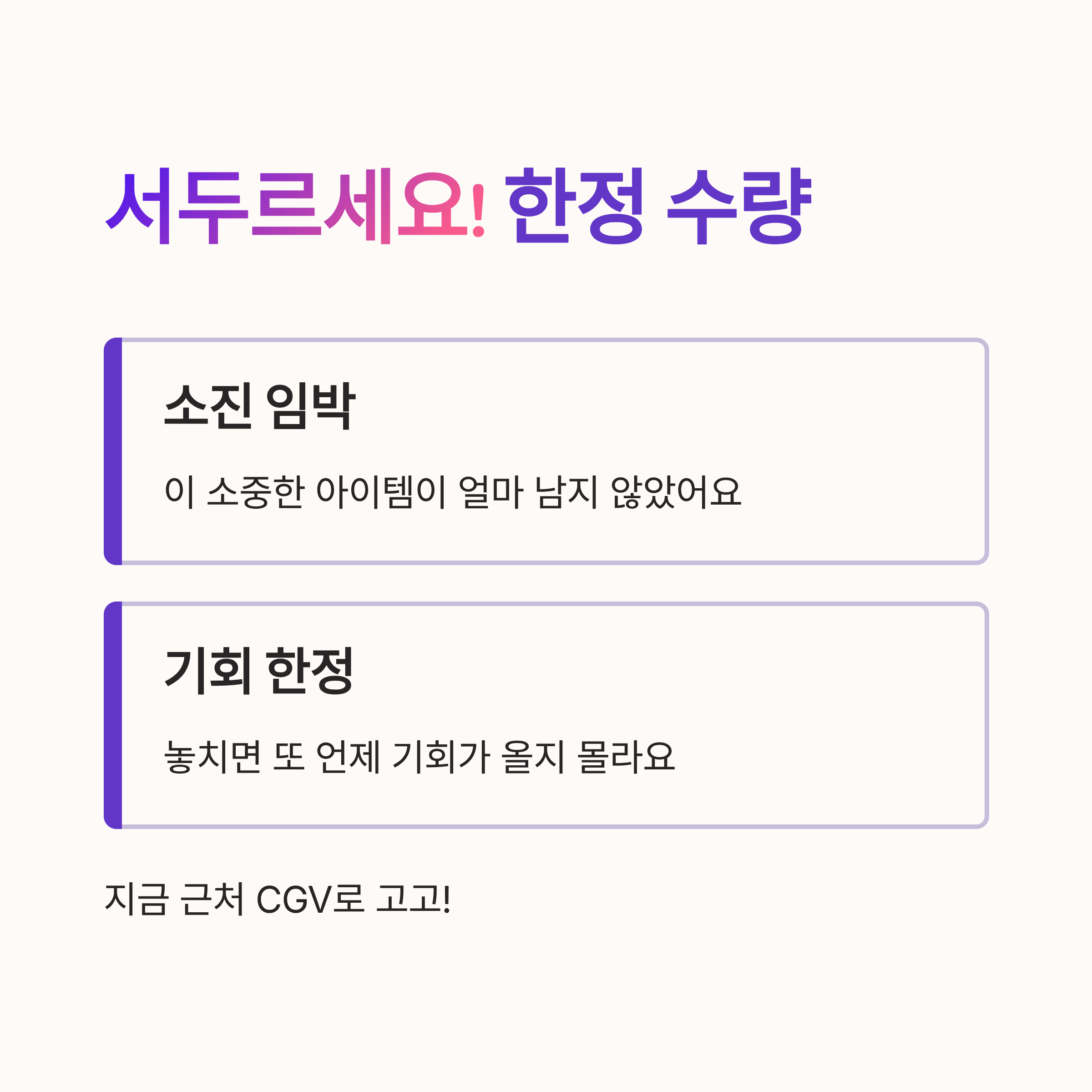 아직도 고민 중이신가요? 이 소중한 아이템이 얼마 남지 않았다는 건 비밀 아닌 비밀이랍니다! 놓치면 또 언제 기회가 올지 몰라요~ 지금 근처 CGV로 고고!