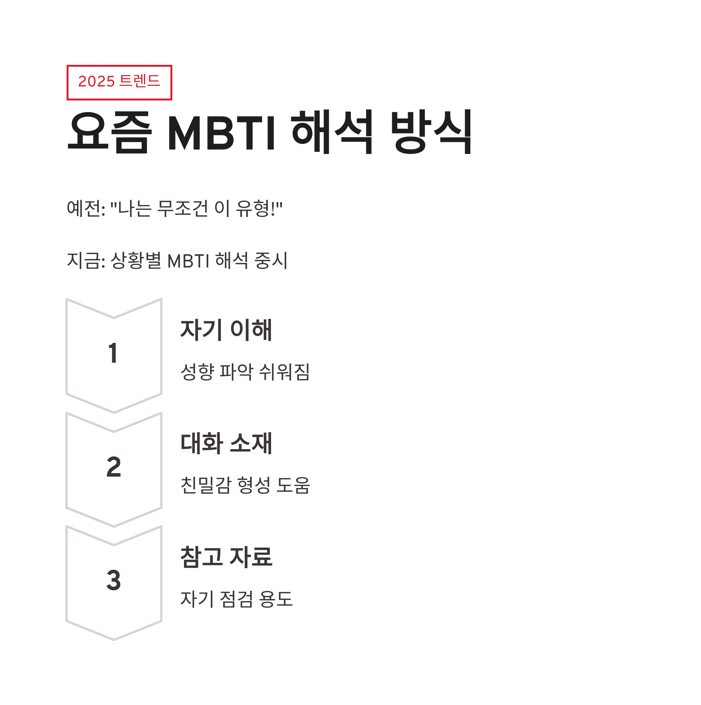 2025년 기준으로 보면 MBTI 검사 트렌드가 살짝 바뀌었어요. 예전엔 “나는 무조건 이 유형!” 이런 느낌이었다면, 요즘은 상황별 MBTI 해석을 더 중요하게 보더라구요. 장점은 자기 이해가 쉬워진다는 거! 대화 소재로도 좋고요 ㅎㅎ 단점이라면… 너무 맹신하면 약간 위험합니다. 저도 예전에 “나는 이 유형이라 원래 그래” 하고 합리화한 적 있었거든요 ㅋㅋ 그래서 저는 MBTI 검사를 참고용으로만 보고, 재미 + 자기 점검 정도로 활용하는 편이에요.