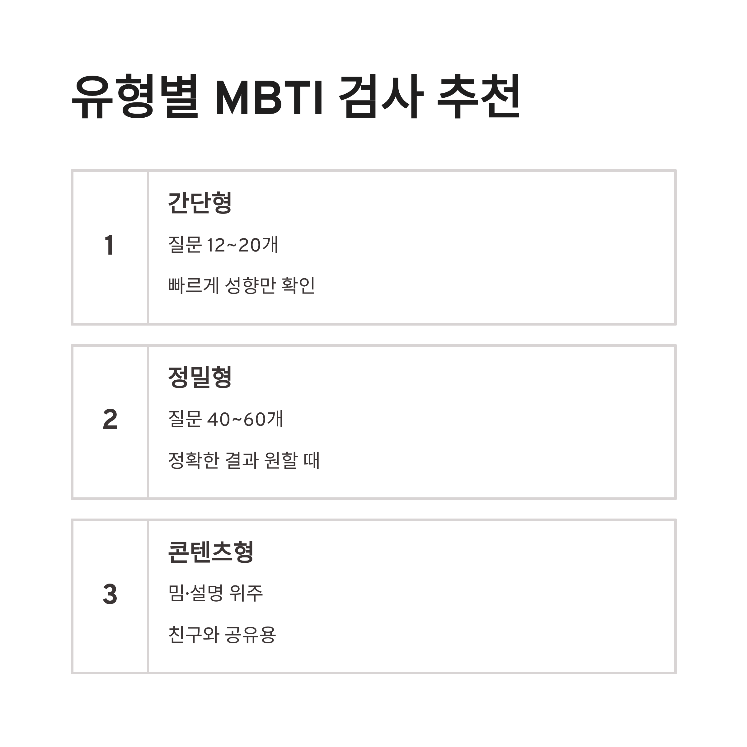 | 간단형 | 질문 12~20개 내외 | 빠르게 성향만 알고 싶은 분 |