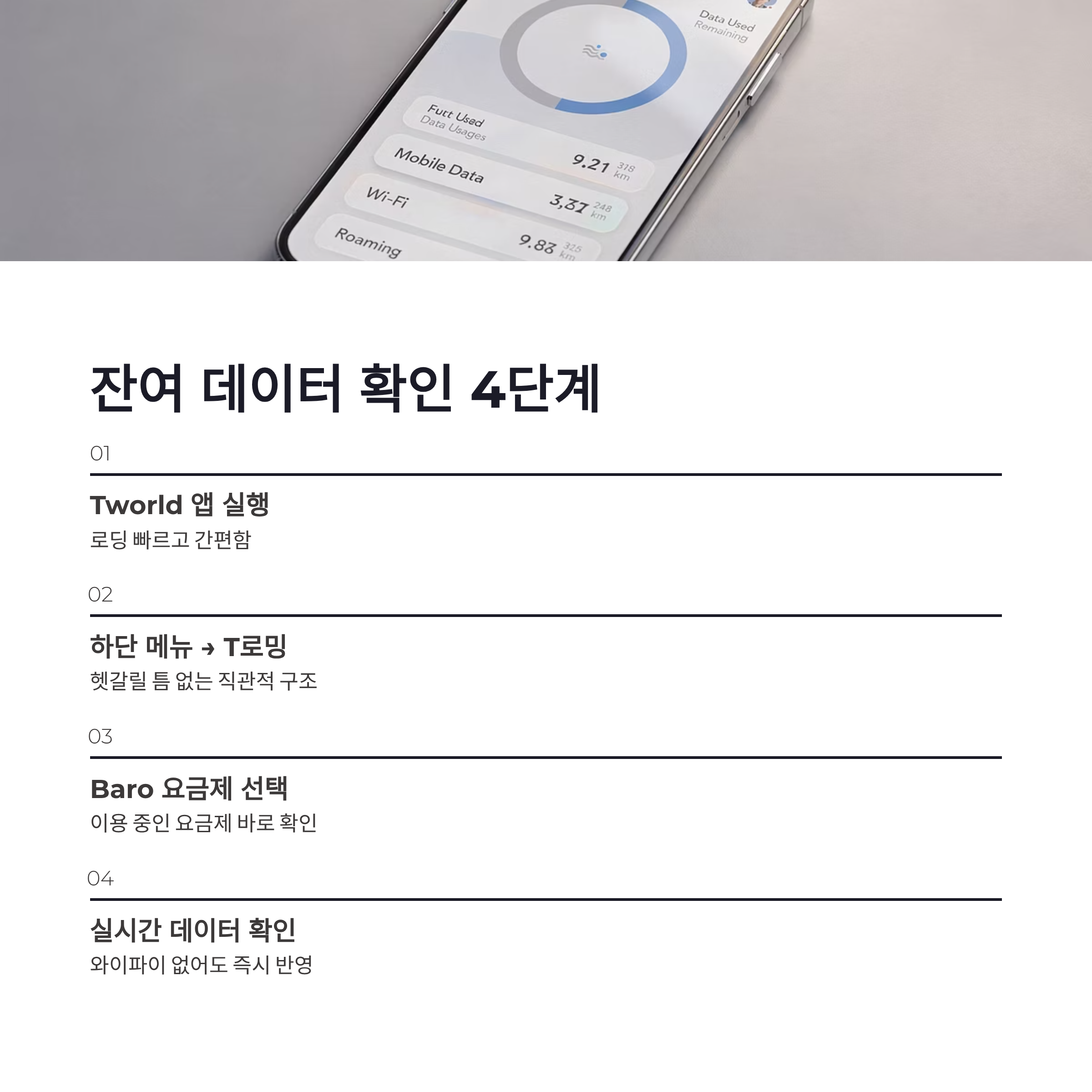 | 단계 | 확인 경로 | 느낌 | | -- | ----------------- | -------- | | 1 | Tworld 앱 실행 | 로딩 빠름 | | 2 | 하단 메뉴 → T로밍 | 헷갈릴 틈 없음 | | 3 | 이용 중인 Baro 요금제 선택 | 바로 보임 | | 4 | 잔여 데이터 확인 | 실시간 반영 |